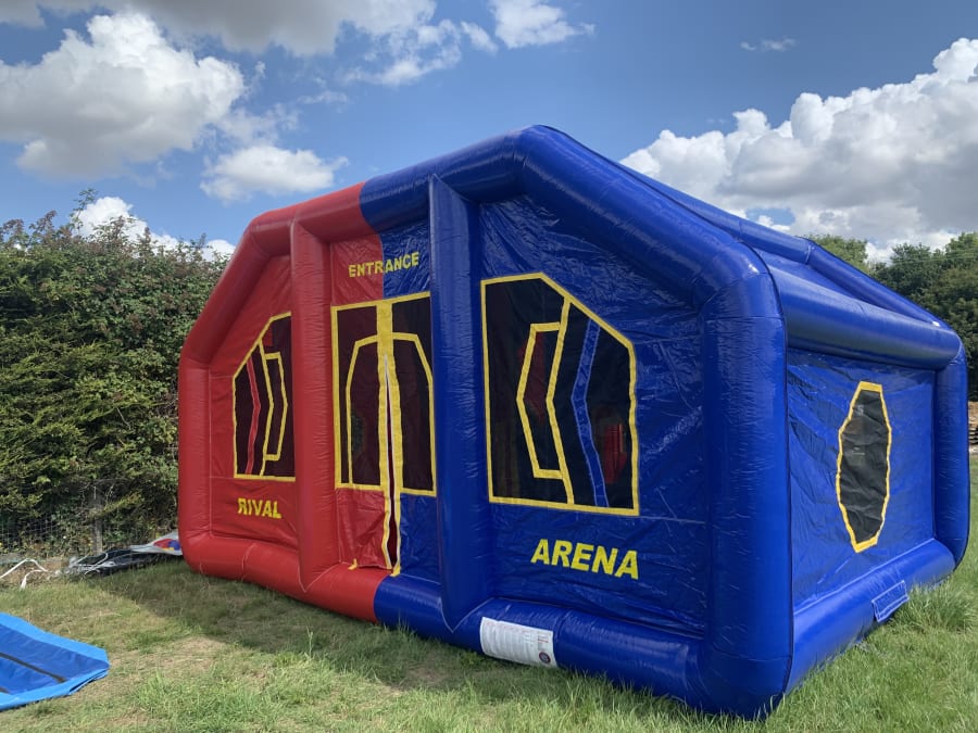Brand new to our fleet is the totally amazing electronic battle arena one of only 2 in the whole of the U.K. unlike so many shootout games this inflatable is fully interactive featuring 10 "HIT" discs and an electronic score board display panel which stands outside the arena on its own stand. This game can be played with upto 8 players at a time set the timer for the duration of your game on the control screen then players put on their protective masks we supply, load their rival pump action guns then enter the battle zone. Featuring red and blue guns and masks the game is simple shoot your opponents disks out while protecting your own colour disks. Our trained operators will show you how the games work and various battle sounds to make it a real interactive experience for all players we even supply score cards as a souvenir of players involvement in this state of the art electronic games system. This battle arena is very popular for parties both for children and adults as well as corporate entertainment,weddings and team building days. If you need any further information or help with your booking you can contact us via email info@bouncycastlehirechelmsford.org.uk or phone one of our event team on 07895022736 booking has never been so easy on our full online diary and booking system with email confirmation , staff can also be supplied to run the inflatable so everyone can relax and enjoy the battle while our staff ensure your games run with the maximum fun. we also have many other inflatables to hire for both toddlers and adults so age is never an issue when it comes to having a party or event to remember.