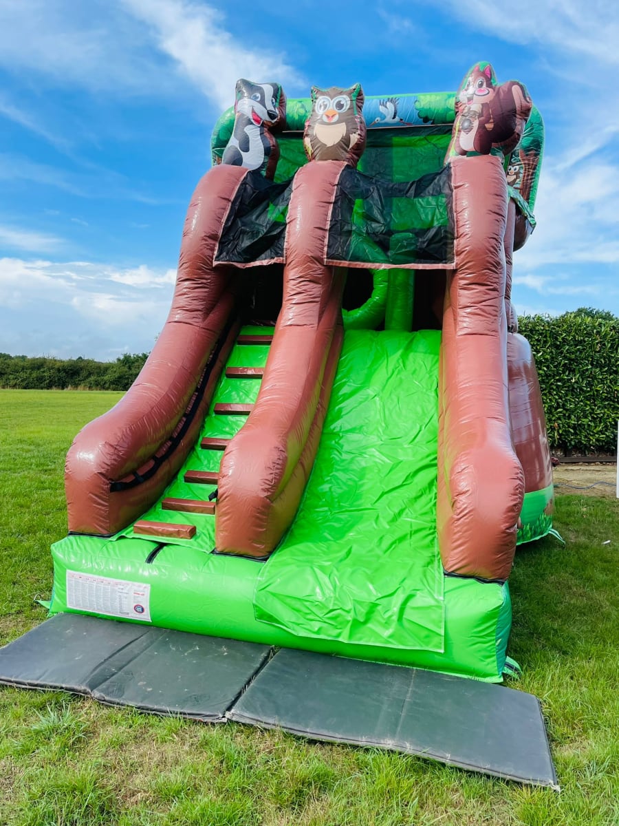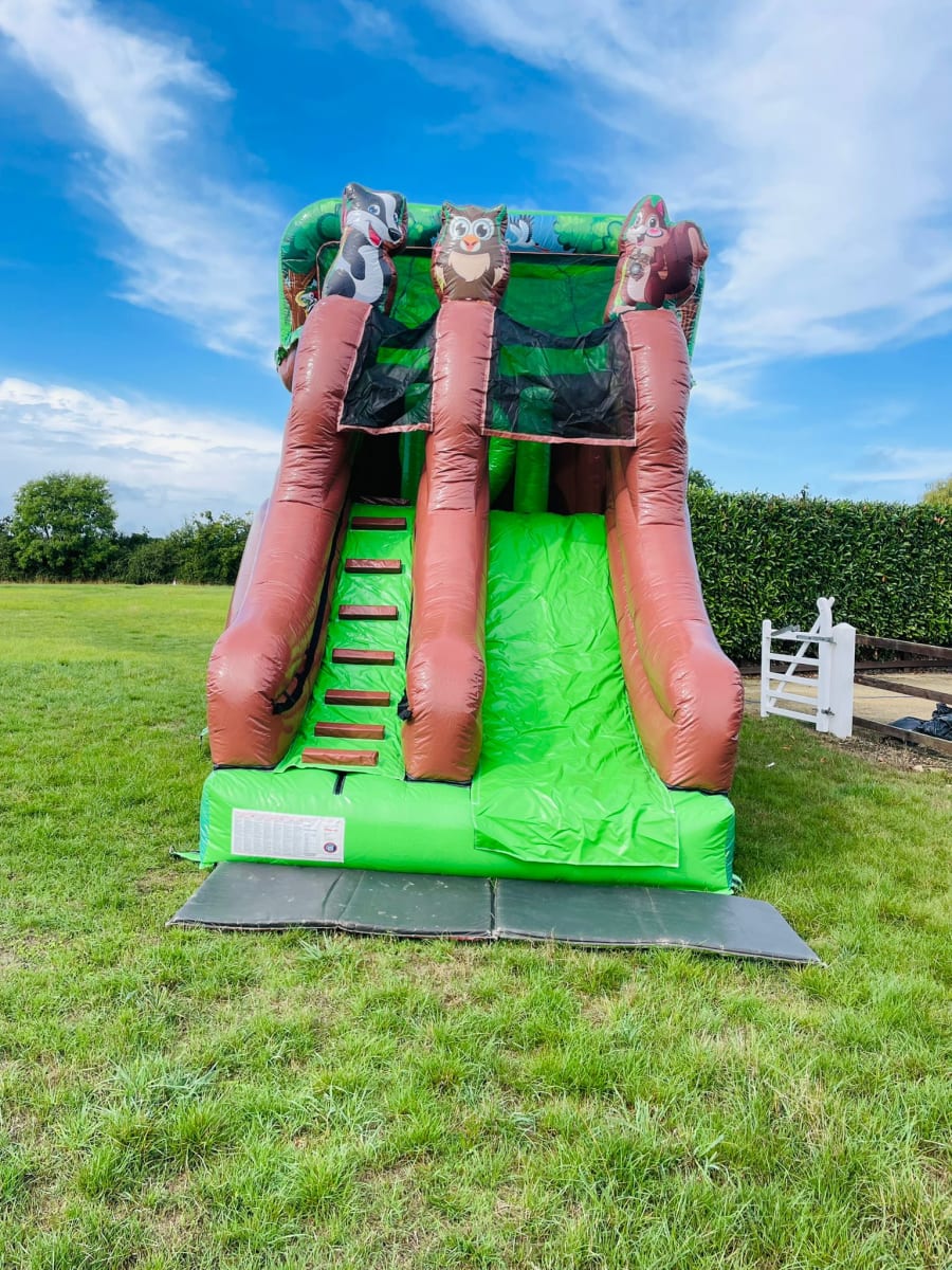 Looking for the ultimate wow factor for your party or event then why not hire this amazing tree house inflatable one of only 4 in the whole of the U.K. every child growing up dreams of having their very own camp , den or tree house so we now can bring that fantasy to your very own garden or event , Climb the steps to reach the top and discover an raised bouncy castle area complete with climb through hoops and a bish bash pillar then whiz down the 8 ft platform slide to return to ground level . This stand out inflatable with stunning artwork and even 3 inflatable woodland animals on top of the tree house will have your party guests entertained for hours on end with both bouncing and sliding or just chilling in their very own full size tree house . Want the party to go into the night then we can over overnight hires and also offer great deals on multi day hires .Our delivery vans cover most of Essex just CLICK HERE to check we cover your area or call one of the team on 07895022736 and we can give you a quotation for further afield deliveries ,We as a company have always had pride in our unique inflatables we purchase to keep us apart from just the standard bouncy castle hire companies and we invest heavily in some amazing items such as the pirate galleon , 3D dinosaur assault course and hold the largest collection of fun fair inflatables to hire in the whole of the U.K. . We also have a wide range of adult bouncy castles , large inflatable slides , activity units and even soft play hire in chelmsford to keep the smaller guests entertained . Many clients like to book more than one product so with this in mind we have created a packages page with some fantastic money saving deals or just CLICK HERE to email our office and we can custom build you a package to suit both your budget and hire needs , Booking your inflatable tree house has never been so easy using our online diary and booking system available 24 hours a day 7 days a week .