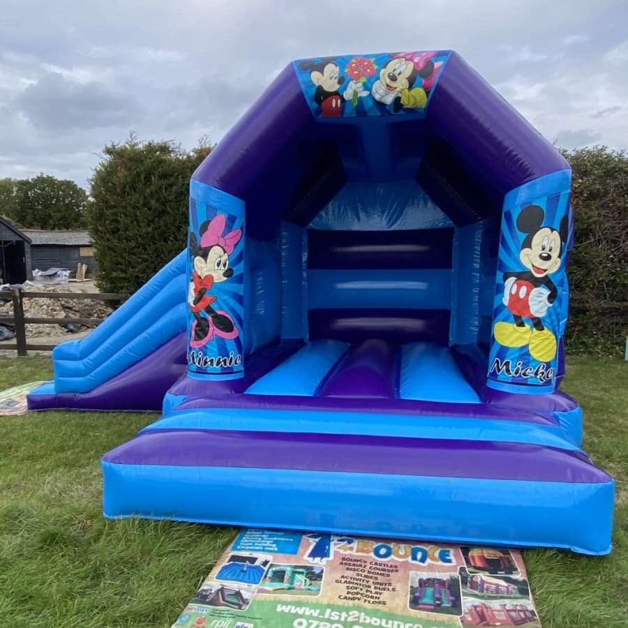 Who in the world hasn't heard of the most famous mouse on the planet ? Did you know that this mega star of the cartoon world has brought happiness and joy to millions of children and adult for over 90 years and we can bring some of the Disney magic to your very own party with this sensational Mickey and Minnie mouse slide bouncy castle . Made in a high gloss material with a built in sun and rain cover this bouncy castle is guaranteed to make any Mickey mouse fans day one to remember and with the added feature of a slide coming out from the side your children will bounce and slide the day away with their 2 most favourite Disney characters and should you wish the party to go on long in to the night or even for a few days then fear not we over both an overnight hire service and discounted rates for multi day bookings both of which you can add to your online booking forms . Want something for the smaller guests then we also have a wide range of soft play to hire in Chelmsford and for the older more adventurous guests then why not have a look at our range of inflatable slides and assault courses we hire all over Essex . Many clients over the years have liked to book several hire products so with this in mind we have a dedicated money saving packages page where you can find some great deals such as our very popular Mickey Mouse Deluxe party package and Mickey's party package alternatively if you can't see a package you like then just CLICK HERE to email our office and we can custom build you a party bundle to suit your budget and hire needs . So you have chosen your inflatable but would like so smaller low cost extras such as giant space hoppers , Side show games or even wiggle cars then we have all of these plus many other party ideas all of which can be found on our party extras page . Although we are a Chelmsford based bouncy castle and soft play hire company our vans do cover most towns and villages in Essex supplying bouncy castle hire in Billericay , Brentwood , Maldon and South Woodham Ferris to name just a few locations to see our full delivery areas we cover just CLICK HERE or call one of the team on 07895022736 for a price on further afield delivery charges . Booking your bouncy castle hire has never been so easy using our online diary and booking system just select your hire date and items you would like then if they are free just hit book now and fill in all of your party details and our team will email you all of your booking details it's that easy and stress free to bring the magic of Disney to your party or event when booking your bouncy castle hire in Essex with 1st 2 bounce inflatables .