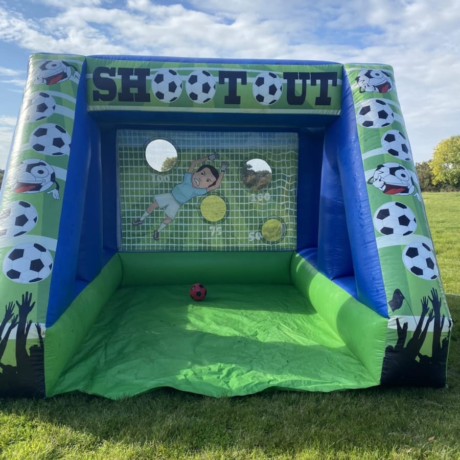 Have you got what it takes to hold your nerve and score the winning penalty to bring the cup home for your club or country ? why not find out how cool you are under pressure with our amazing inflatable football penalty shoot out for hire in Chelmsford and all surrounding areas , Place the ball on the spot take a few steps back and pick your spot the kick the ball and see if you can beat the goalie and hit one of the 4 targets and who ever gets the highest score wins the match . This inflatable is the perfect addition to any sports themed party and even comes with sponge safety balls so no windows or children's faces will be broken or injured while they enjoy the highs and lows of competing in the spot kick challenge . Want to add other sports related inflatables to your party or event then why not check out the full range on our sports inflatables page or have a look on our money saving packages page where you can find the ever popular ultimate sports package or the football fan package , if you would like us to custom build you a package just CLICK HERE to email the office and we can use over 12 years experience in the entertainments industry to make your party or event the success you wanted it to be within your budget .Its not only sports themed inflatables we have to offer on our hire fleet we also hold one of the largest ranges of fun fair inflatables in the U.K. as well as the classic princess and pirate themes and for the dino fans why not check out our stunning range of dinosaur bouncy castles . Looking for something for the older guests then we have a wide range of adult bouncy castles , inflatable slides , assault courses and high energy inflatable games such as gladiator duels and sumo suits and for the younger guests we also off soft play hire in Chelmsford and all surrounding areas . Want some extra fun to add to your order then why not have a look through our party extras page where you can find lots of great party add on's such as giant space hoppers and swing cars , Although we are a Chelmsford based inflatable hire company we do cover a wide ranges of locations across Essex from bouncy castle hire in Billericay and Wickford to soft play hire in Brentwood and South Woodham Ferris just CLICK HERE to see if we cover your area or call the office on 07895022736 for out of area and full U.K. delivery services .
