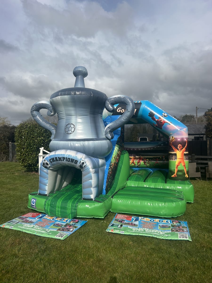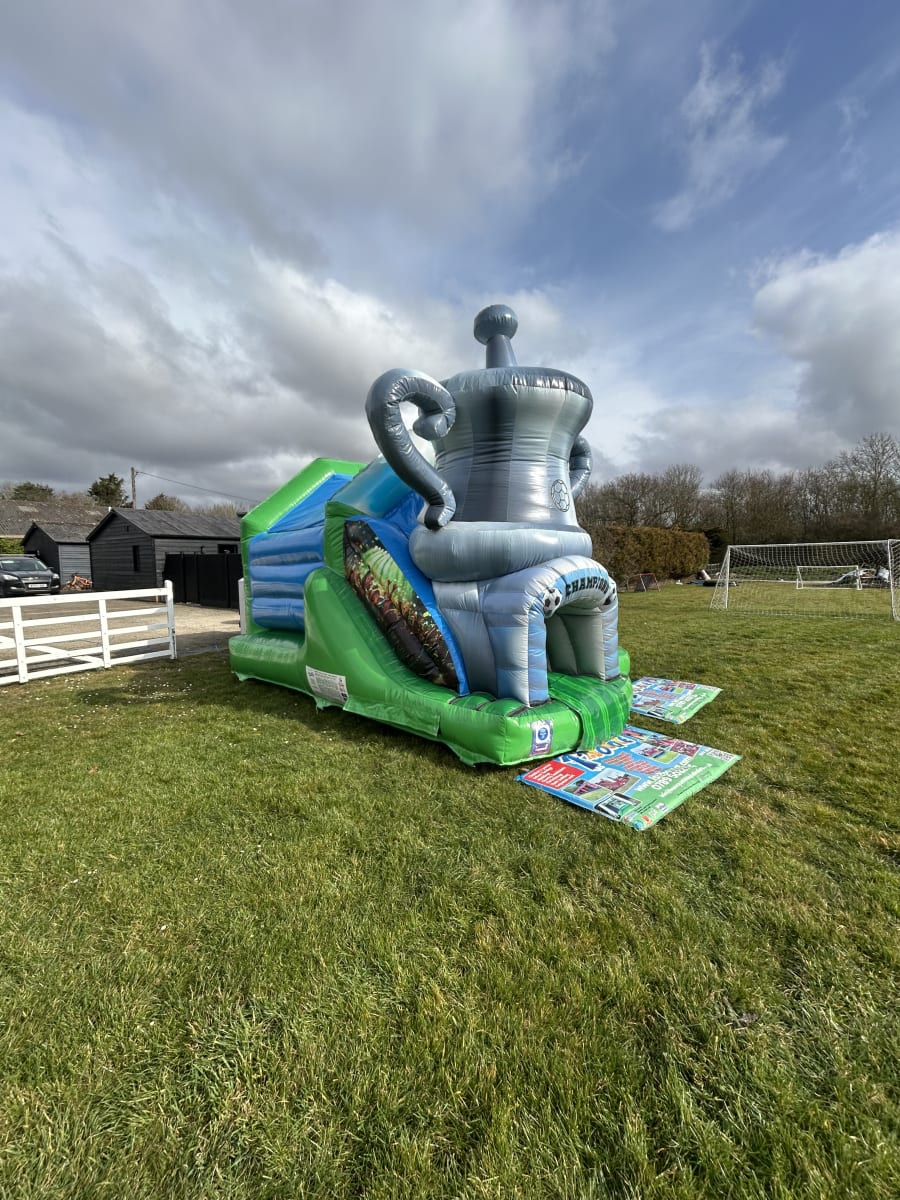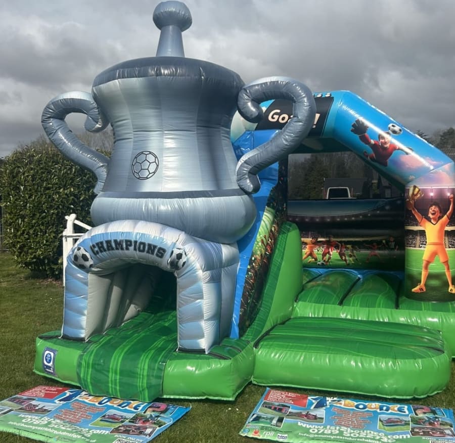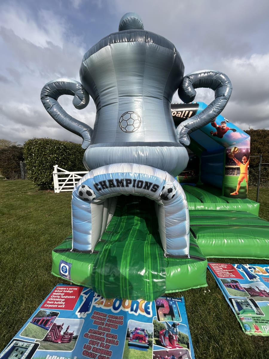 If you are stuck for Football party ideas in Essex then this inflatable will be the perfect answer as we can now bring the magic of the FA Cup to your very own party or football event with this stunning football slide bouncy castle available to hire in Chelmsford and all surrounding areas across Essex .This inflatable was custom made for us by one of Europe's leading manufactures and is currently the only one of its kind in the U.K. Boasting a large bounce area for your children to play in and with the added twist of a slide coming out from the front in the form of the worlds most famous trophy and as they slide down they appear at the exit which is the tunnel of champions , Made in a high gloss grass effect material and with stunning football artwork across the whole inflatable you children will really feel like they are stepping on to the famous Wembley playing field and fulfil every footballers dream of lifting the F.A. cup in front of thousands of fans making it the perfect inflatable to have in your very own back garden or if you want to use a village hall we have a great list with contact details on many of which we are the recommended suppliers to just see