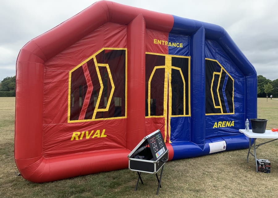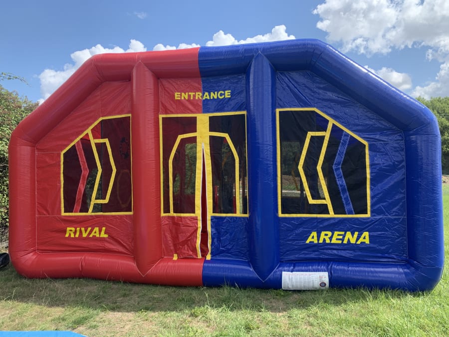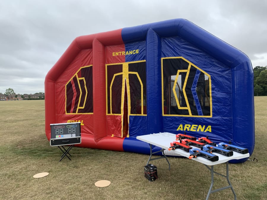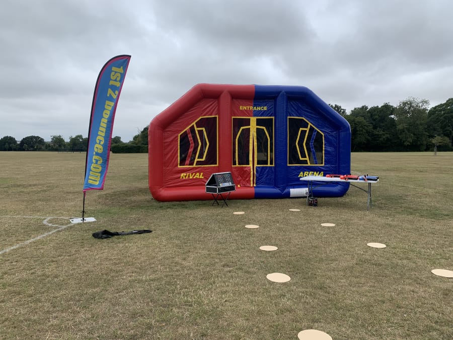 Brand new to our fleet is the totally amazing electronic battle arena one of only 2 in the whole of the U.K. unlike so many shootout games this inflatable is fully interactive featuring 10 "HIT" discs and an electronic score board display panel which stands outside the arena on its own stand. This game can be played with upto 8 players at a time set the timer for the duration of your game on the control screen then players put on their protective masks we supply, load their rival pump action guns then enter the battle zone. Featuring red and blue guns and masks the game is simple shoot your opponents disks out while protecting your own colour disks. Our trained operators will show you how the games work and various battle sounds to make it a real interactive experience for all players we even supply score cards as a souvenir of players involvement in this state of the art electronic games system. This battle arena is very popular for parties both for children and adults as well as corporate entertainment,weddings and team building days. If you need any further information or help with your booking you can contact us via email info@bouncycastlehirechelmsford.org.uk or phone one of our event team on 07895022736 booking has never been so easy on our full online diary and booking system with email confirmation , staff can also be supplied to run the inflatable so everyone can relax and enjoy the battle while our staff ensure your games run with the maximum fun. we also have many other inflatables to hire for both toddlers and adults so age is never an issue when it comes to having a party or event to remember.