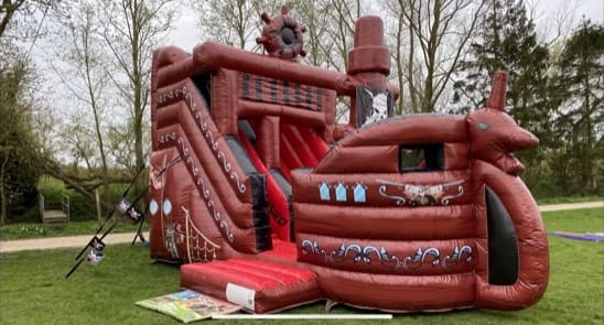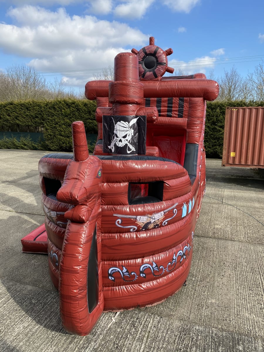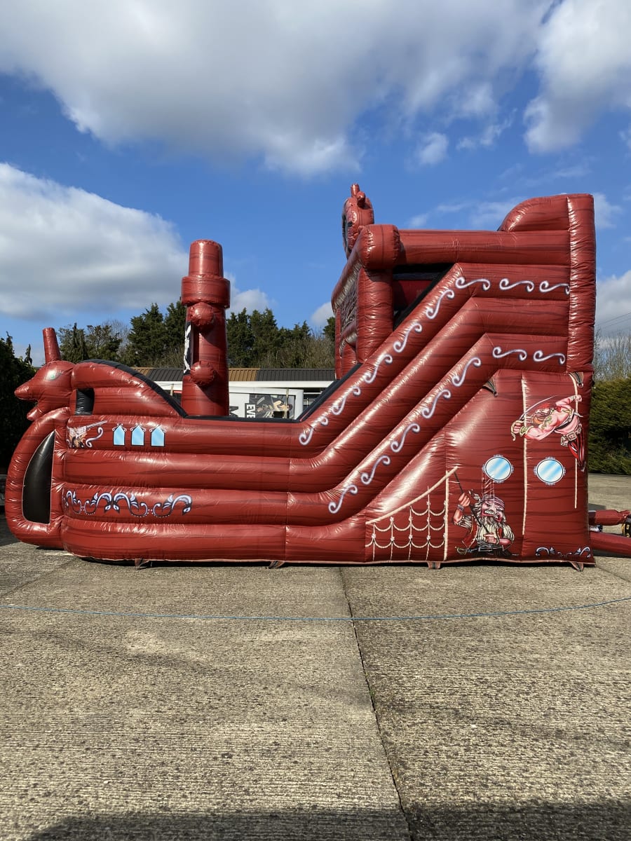 Brand new to our fleet of inflatables is the amazing Pirate Galleon Ship Castle measuring a whopping 30ft in length this is hands down one of the most impressive life size pirate inflatables you can hire anywhere in Essex , featuring a great bounce area and run around zone in the floor area then climb the rigging to the top of the 8ft platform slide and whiz back down to the ships deck this really will be the stand out inflatable if your looking for pirate party ideas to hire for your event or party . This impressive pirate ship stands 17 feet tall and is just under 14 feet wide and features fantastic life like artwork to really give the impression of a real life galleon in your garden , We have fully designed this inflatable and had it made custom to our very high standards by a leading U.K. manufacture and is the only one of its kind in Essex . We currently have one of the largest ranges of