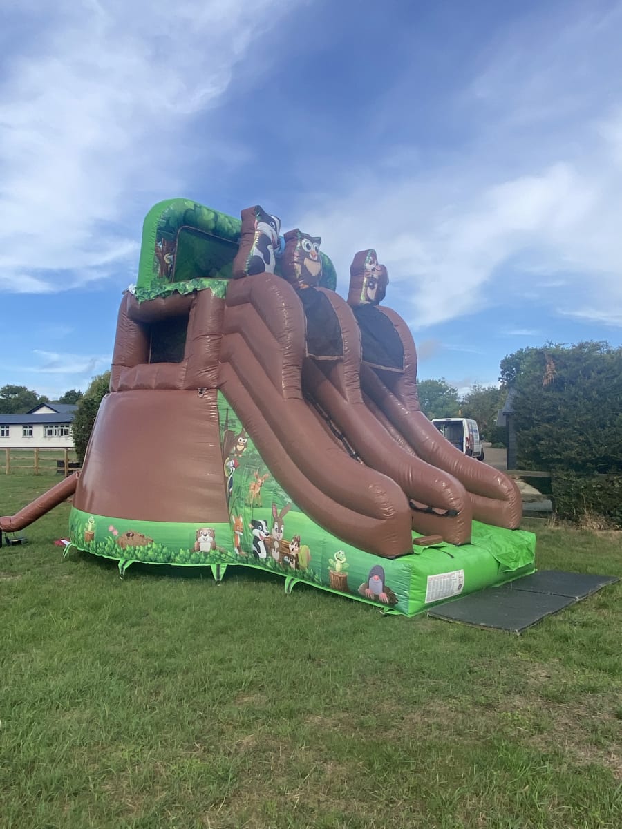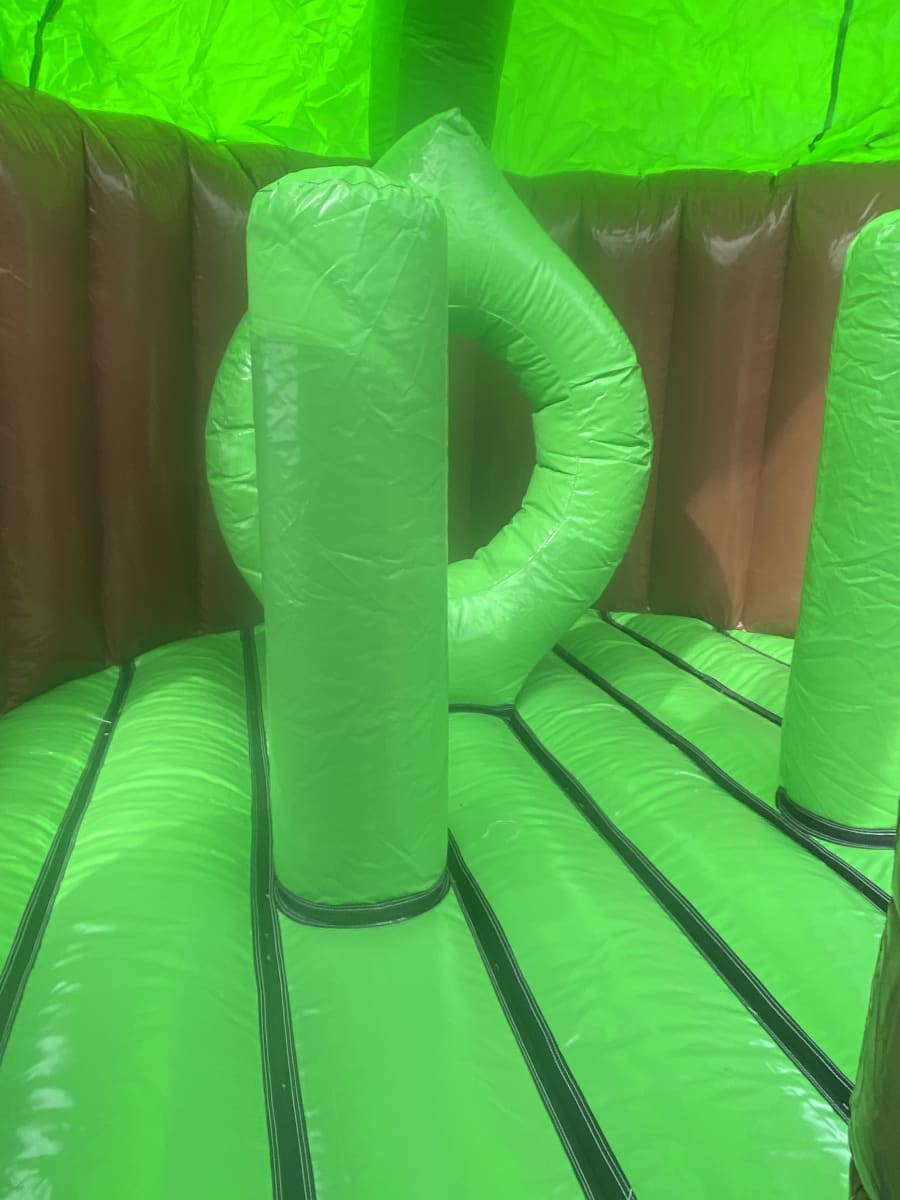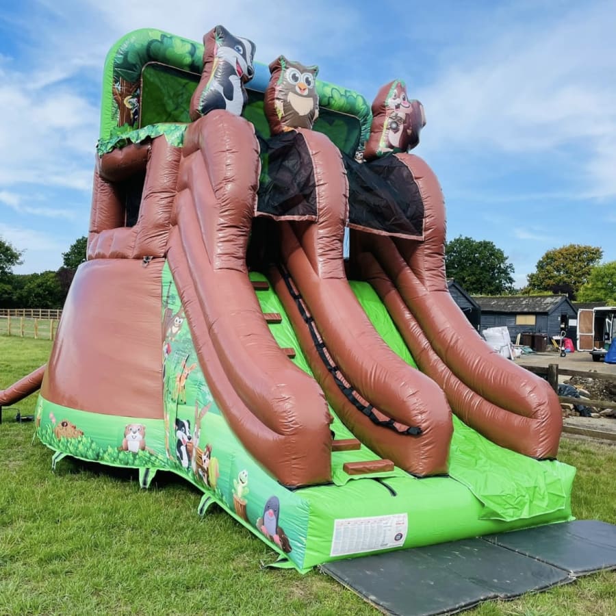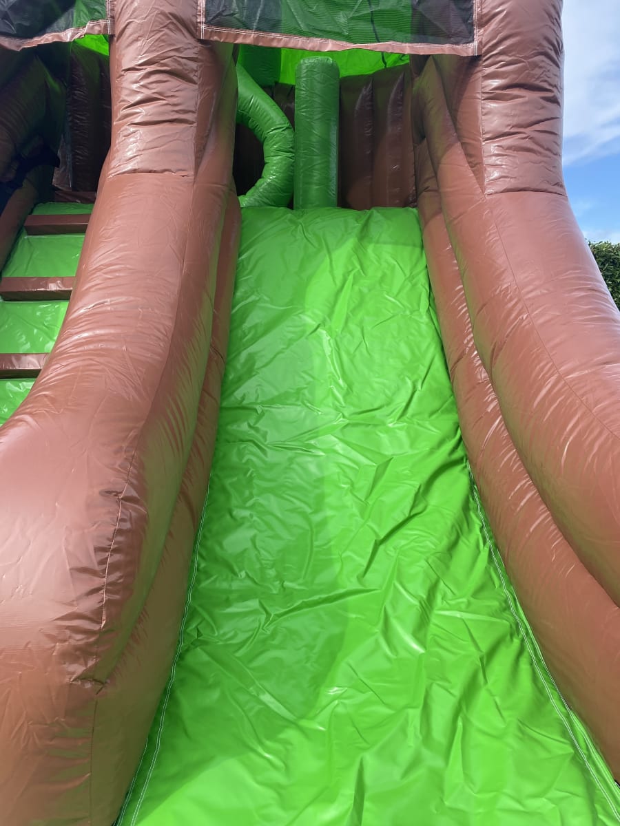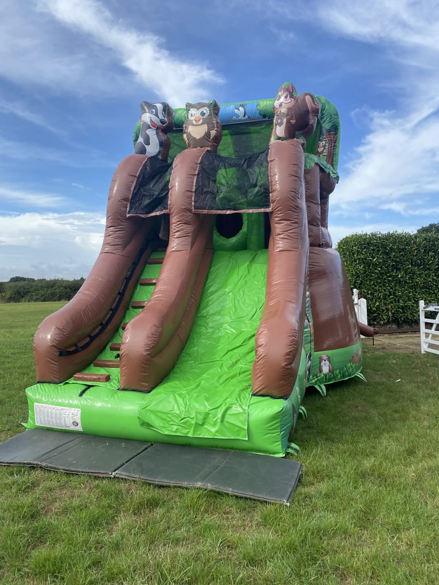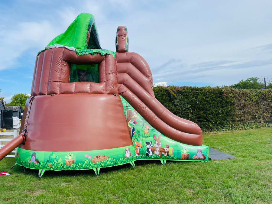 Looking for the ultimate wow factor for your party or event then why not hire this amazing tree house inflatable one of only 4 in the whole of the U.K. every child growing up dreams of having their very own camp , den or tree house so we now can bring that fantasy to your very own garden or event , Climb the steps to reach the top and discover an raised bouncy castle area complete with climb through hoops and a bish bash pillar then whiz down the 8 ft platform slide to return to ground level . This stand out inflatable with stunning artwork and even 3 inflatable woodland animals on top of the tree house will have your party guests entertained for hours on end with both bouncing and sliding or just chilling in their very own full size tree house . Want the party to go into the night then we can over overnight hires and also offer great deals on multi day hires .Our delivery vans cover most of Essex just CLICK HERE to check we cover your area or call one of the team on 07895022736 and we can give you a quotation for further afield deliveries ,We as a company have always had pride in our unique inflatables we purchase to keep us apart from just the standard bouncy castle hire companies and we invest heavily in some amazing items such as the pirate galleon , 3D dinosaur assault course and hold the largest collection of fun fair inflatables to hire in the whole of the U.K. . We also have a wide range of adult bouncy castles , large inflatable slides , activity units and even soft play hire in chelmsford to keep the smaller guests entertained . Many clients like to book more than one product so with this in mind we have created a packages page with some fantastic money saving deals or just CLICK HERE to email our office and we can custom build you a package to suit both your budget and hire needs , Booking your inflatable tree house has never been so easy using our online diary and booking system available 24 hours a day 7 days a week .