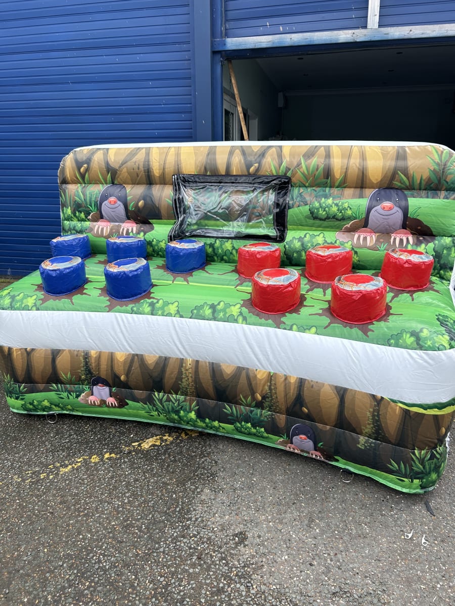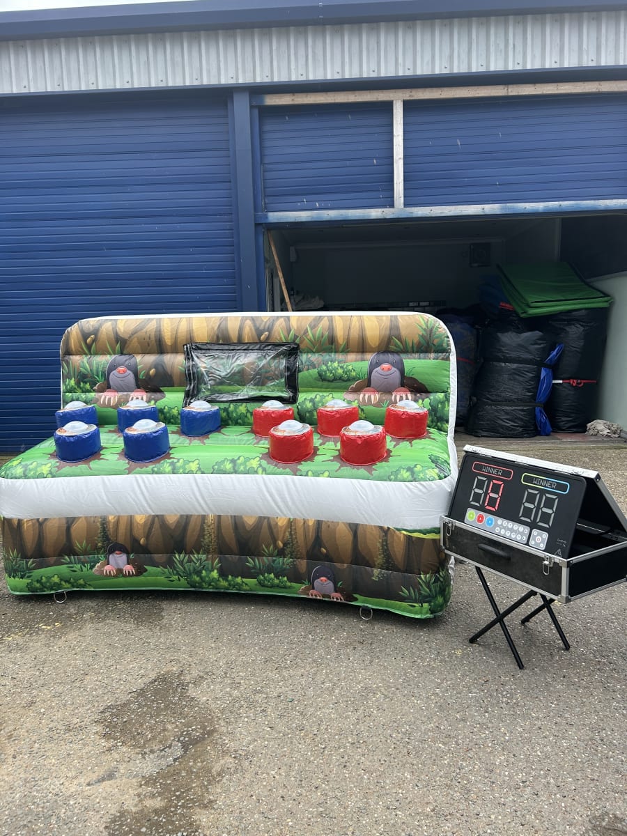 Looking for something totally different to your party or corporate event hire then we have the perfect team building and highly addictive entertainment solution with our amazing electronic wack a mole game , this game has combined the use of an inflatable with the latest in gaming technology to create one of the most competitive products on our hire fleet . using hit sensitive disks with a large blue tooth linked score board the aim of this two player game is to knock out the coloured disks as they light up and after your pre set time ends the winner will be announced and the built in speaker system making it the must have game for family events or corporate event hire in Essex . Our delivery drivers will set this game up either indoors or outside and demonstrate how the system works leaving you to have hours of competitive fun or we can even supply smartly dressed staff to manage your event . Looking for other hire items to make your event one to remember then why not have a look at
