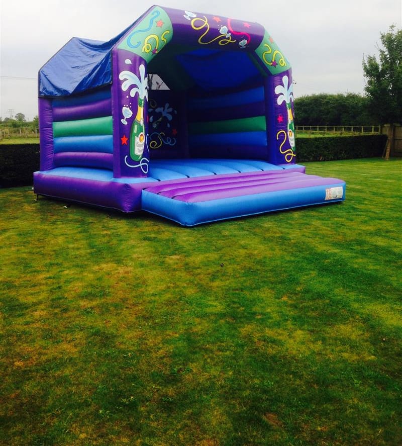 If your are looking for an extra special bouncy castle for all ages then this inflatable is the perfect choice,The stunning artwork features champagne bottles and streamers all over the front making it the obvious choice for weddings or special coming of age birthdays.This castle is built to adult spec so there is no limit to age groups and with a built in rain/sun cover not even the weather can stop everybody having a fantastic time at your party,we can also supply pop corn and candy floss,