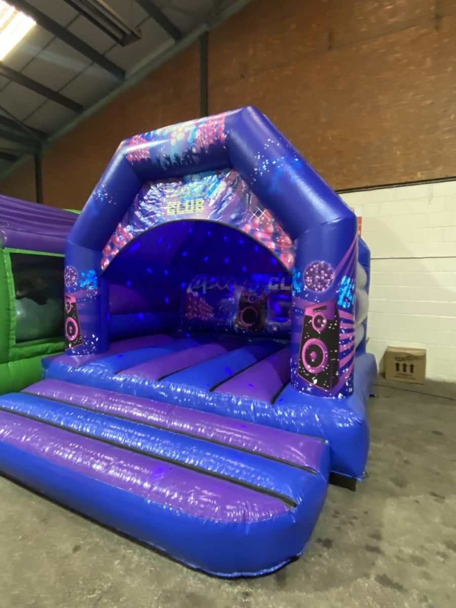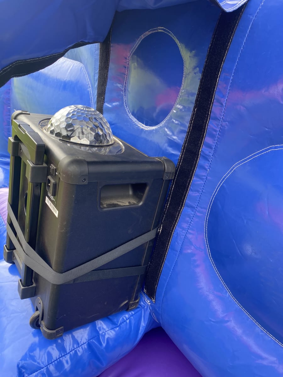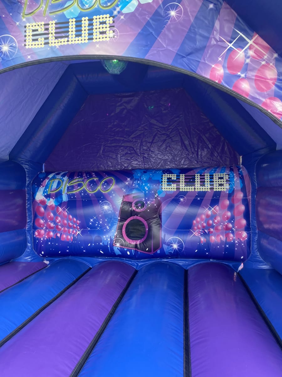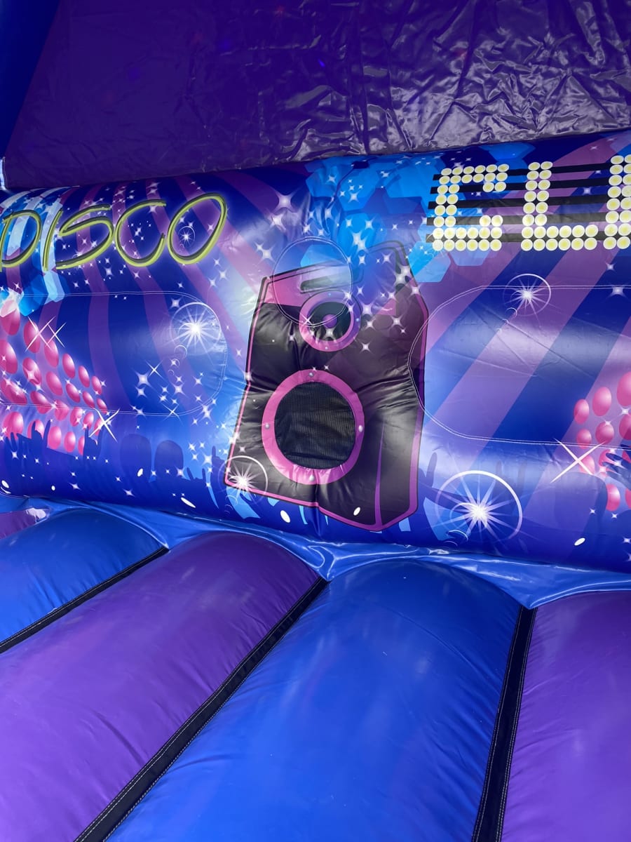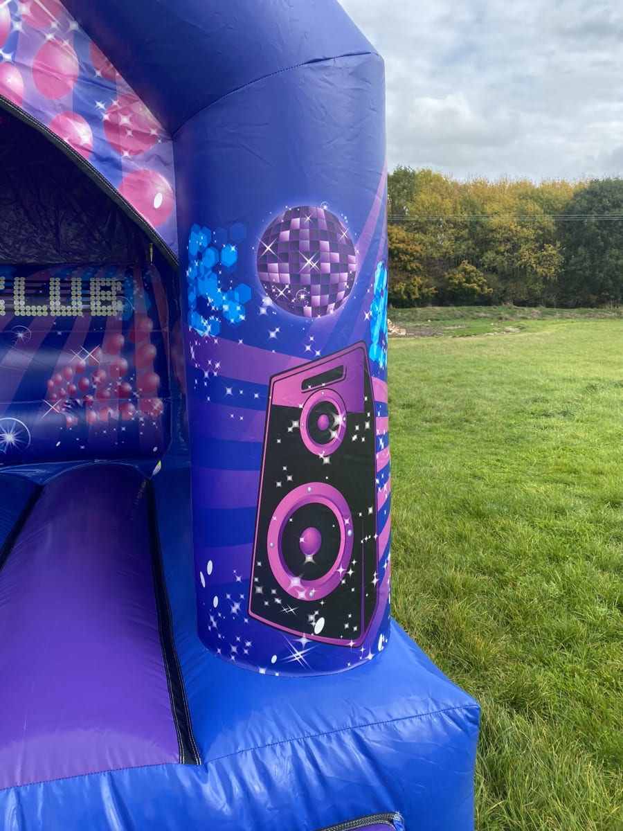 Looking for a bouncy castle with a little difference well then this fits the ticket this is a standard 12ft x 12ft sized bouncy castle but with the added twist of having a built in disco light and blue tooth speaker to really make your party one to remember while your guests bounce and dance the night away . Made in a high gloss material and with stunning artwork this disco bouncy castle has been a very popular inflatable with all our clients , if you wish to go bigger we also can supply full sized adult sized disco domes or even inflatable nightclubs to you very own garden or venue . Our delivery vans cover most of Essex every day just CLICK HERE to see if we cover your town or village or call one of the team on 07895022736 and we can supply a delivery quotation . Its not only disco castle hire in Chelmsford we supply we also have a wide range of adult bouncy castle hire , assault courses , large inflatable slides as well as soft play hire and large high energy games such as gladiator duels and electronic shootouts . Many clients look to book several items so with this in mind we have added a dedicated packages page for some fantastic money saving ideas or CLICK HERE to email our office if you wish us to build you a custom built package to suit your hire needs . We also can supply a wide range of party extras from space hoppers to giant connect 4 games we really do have all bases covered to make your event extra special , all of our inflatables can be booked either for just the day or overnight and we can offer some great deals for multi day bookings all of which can be made online 24 hours a day 7 days a week using our online diary and booking system to make you party planning as stress free as possible .