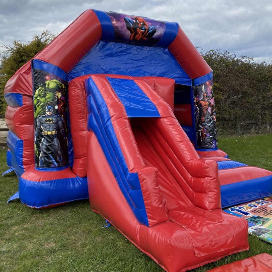 slide combo bouncy castle , similar to a standard bouncy castle but with the added twist of an inflatable slide coming out of the front for something just a little bit different for your super hero party hire . This bouncy castle features all of the favourite and popular super heros like Batman, The hulk , iron man and many more all on a stunning high gloss finished castle this really is the perfect super hero bouncy castle available to hire in Essex and with a built in rain / sun cover even the sometimes unpredictable English weather wont stop your little super heros having fun at their party or event . Our vans cover