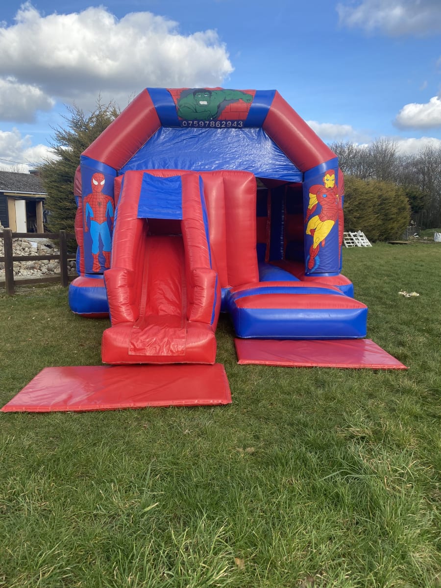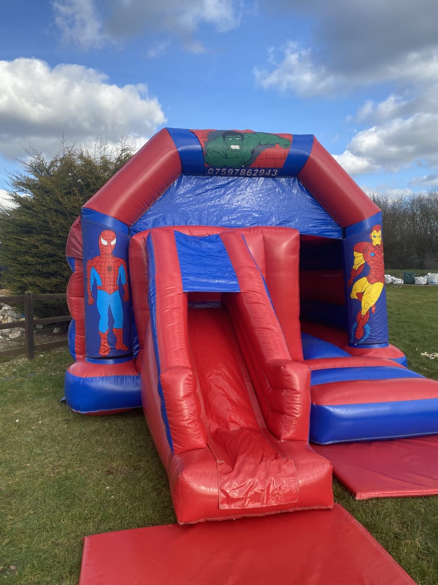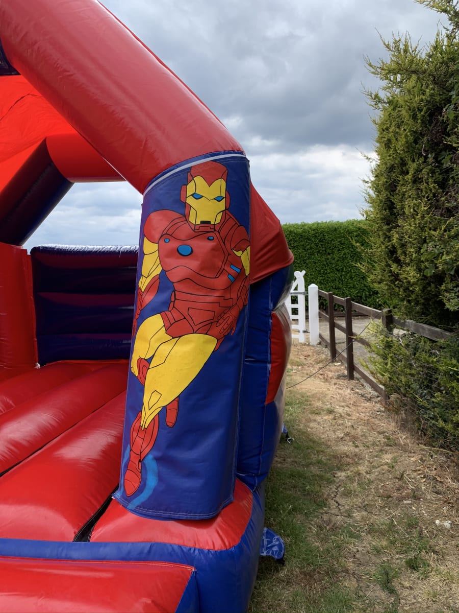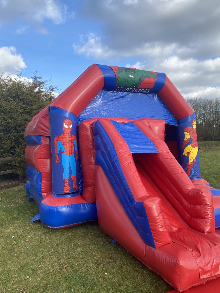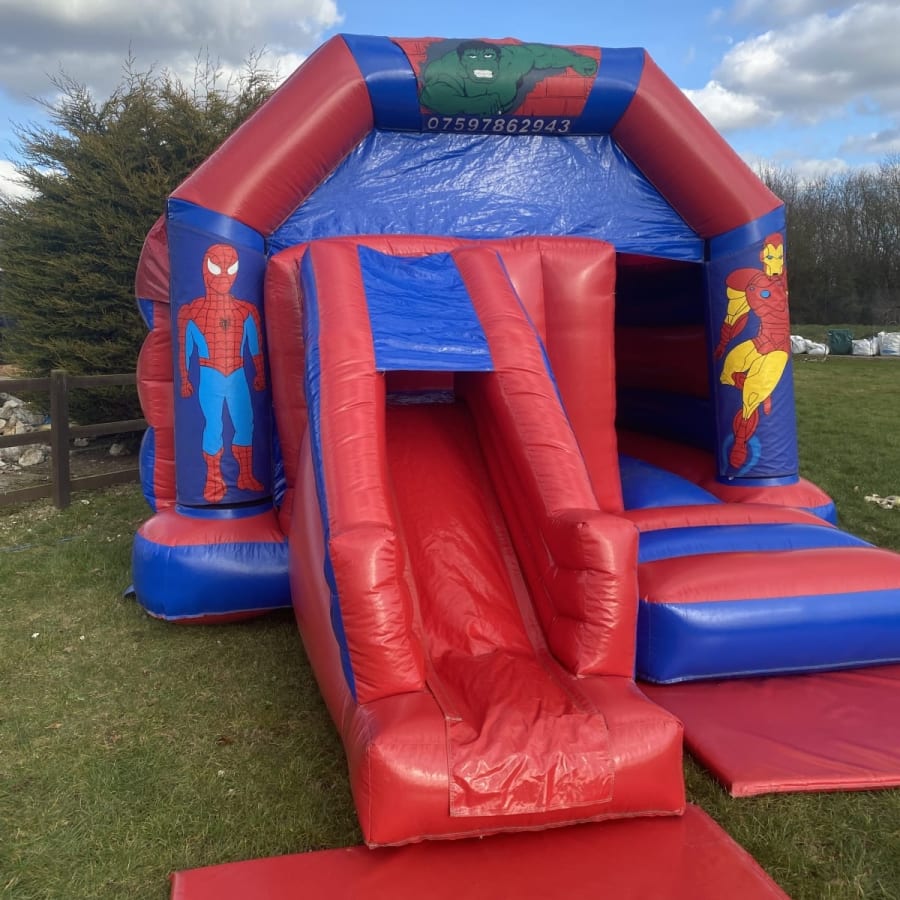 Featuring 3 of marvels most popular characters Spider man , The incredible Hulk and Iron man the only super hero missing is your little ones , This super hero bouncy castle to hire in Chelmsford and all surrounding areas is basically a standard castle but with the added twist of a slide coming out from the front to keep your little super heros entertained all day long . Finished on a high gloss material this super hero slide castle is a real stand out inflatable and with a built in rain and sun cover even the weather wont stop your heros completing their mission . Although we are a Chelmsford based bouncy castle hire company our vans cover most of Essex every day from Billericay bouncy castle hire to soft play hire in South Woodham Ferrers just CLICK HERE to check our areas covered . Looking for something for the smaller guests then why not look on our soft play hire page or for the older more energetic we also have one of the largest ranges of adult bouncy castles , assault courses and activity inflatables anywhere in Essex . Booking your super hero bouncy castle is very simple just select your item and date then using our online diary just check for availability and if it is free then just select book now and fill in your details it really is that easy and stress free when looking for superhero party ideas , you can get the most commonly asked questions answered on our FAQs page or by calling one of the team on 07895022736 . We also have a wide range of free party invites you can download and for clients looking to book more than one item why not have a look on our packages page for some great money saving ideas or just CLICK HERE to email our office and we can build a package to fit your budget .