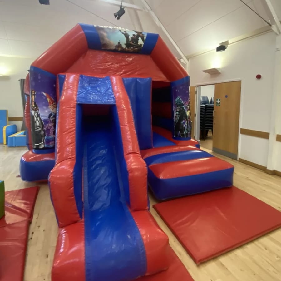 soft play hire products on our fleet . While would not recommend your children go to battle on our fortnite slide castle why not let them celebrate their party or event while surrounded by the online characters from this top selling video game . This inflatable has a standard bounce area but with the added twist of an inflatable slide coming out of the front mix that with stunning high gloss artwork on each side and combine that with a high gloss inflatable bed this really is the stand out fortnite inflatable to hire anywhere in Essex and with a built in sun and rain cover not even the sometimes unpredictable UK weather will spoil your fortnite party or event . Although we are a Chelmsford based bouncy castle hire company our vans cover almost all of Essex from