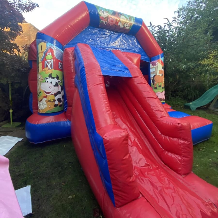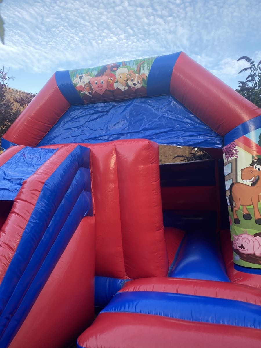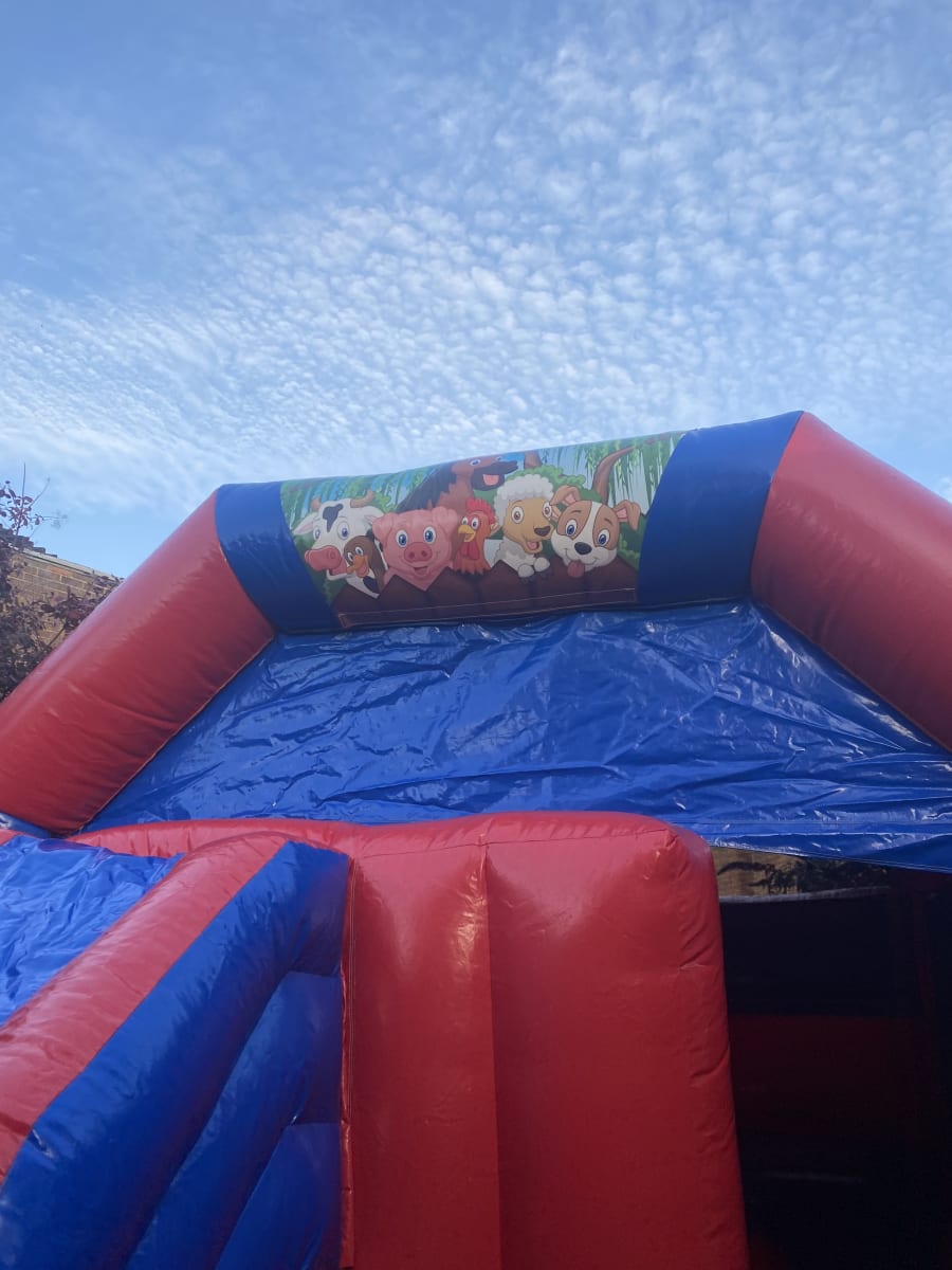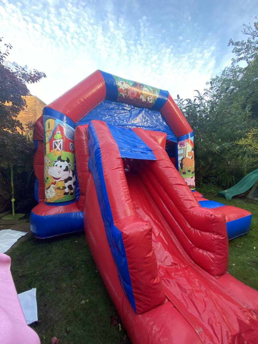 New in to our fleet this year is the front slide Farmyard themed bouncy castle available to hire in Chelmsford and all surrounding areas , made in a high gloss material and with bright and colourful cartoon style farm animals this really will be the perfect addition to any animal loving child,s party . Similar to a standard bouncy castle but with the added twist of a slide coming out from the front of the castle this inflatable is guaranteed to keep the most active of children busy for hours on end . We also can provide fun for the younger guests at your party or event with our soft play hire in Chelmsford we offer as well as a wide range of adult bounce castles to hire , inflatable slide hire , assault courses and even activity inflatables such as the amazing kids kingdom . Although we are a Chelmsford based bouncy castle company our vans cover most of Essex just CLICK HERE to check we cover your town or village or call one of the team on 07895022736 and we will be only to happy to help . For bookings of more than 1 item it may save you money by having a look on our dedicated packages page to find some amazing money saving deals and packages or CLICK HERE to email our office if you wish to have a custom package to suit both your event requirements and budget . Many of the most commonly asked questions and answers can be found on our FAQ,s page. Bookings can be made online using our online diary and booking system 24/7 just select your item and date to check they are free then just hit book now and fill in all your details and we will do the rest , it really is that easy and stress free when using 1st 2 bounce inflatables for your party and event needs .