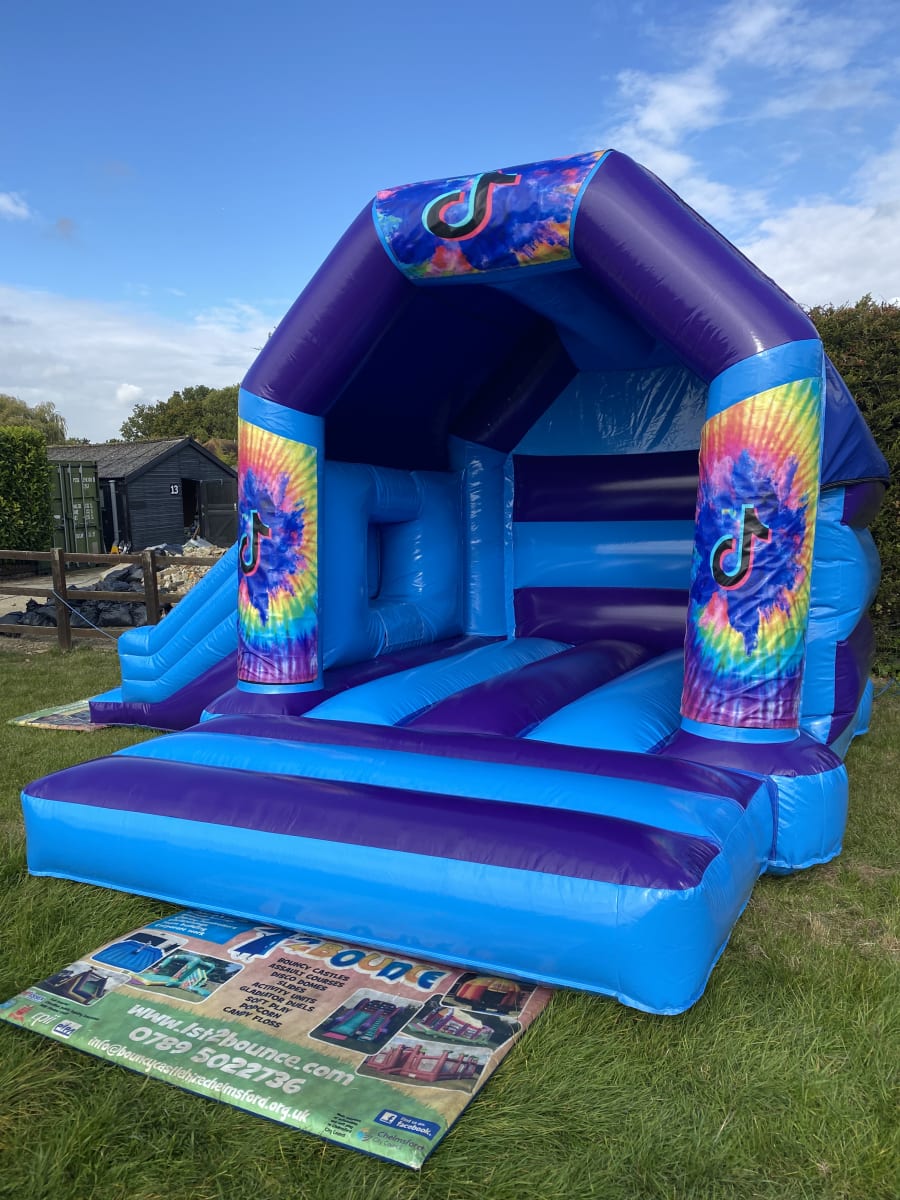 One of the most popular and biggest social media platforms in recent times has been the birth of Tik Tok where users create an account and simply upload their videos for the world to see and dream of going viral and having millions of views on their trending dance or funny video they have posted and what better way to create your new content whilst having maximum fun is with this amazing Tik Tok themed bouncy castle available to hire in Chelmsford . Made in a high gloss material and with a built in slide coming out from the side this inflatable ticks all the boxes for entertainment value for all your party guests and a great backdrop for your future social media stars . Looking for something for the younger guests then we have a wide range of soft play to hire in Chelmsford and surrounding areas and for the older guests including adults then be sure to have a look on our inflatable slide and assault courses to hire in Essex page . Many clients do ask if they can order more than one hire item and the answer if yes so be sure to check out our packages page where you can find some fantastic money saving ideas or just CLICK HERE to email our office and we can custom build you a package to suit your budget and hire needs . Want to add some smaller finishing touches to your event such as giant space hoppers , fun fair side show games or even large garden games then all of these and many other ideas can be found on our party extras page . Being not only the largest but also the most established bouncy castle hire company in Chelmsford is something we are very proud of and are now entering our 12th year of working directly for the city council and with over 400,000 followers on our very own Tik Tok platform are easily the most followed inflatable company in the U.K. in fact we are closing in of being the most followed in the world on this social media platform mainly due to our vast range of custom built inflatables . Our delivery vans cover most towns and villages in Essex from Brentwood and Billericay bouncy castle hires to soft play hires in Wickford and Witham to see our full delivery areas page just CLICK HERE or call one of the team on 07895022736 for delivery charges for out of areas locations . Booking your Tik Tok bouncy castle hire in Essex has never been so easy using our online diary and booking system just select your hire items and dates to check they are free then if they are available just hit book now and fill in all of your event details , it really is that easy and stress free to make your Tik Tok party ideas go viral when using 1st 2 bounce inflatables home of the the Tik Tok famous "bouncy castle man" .