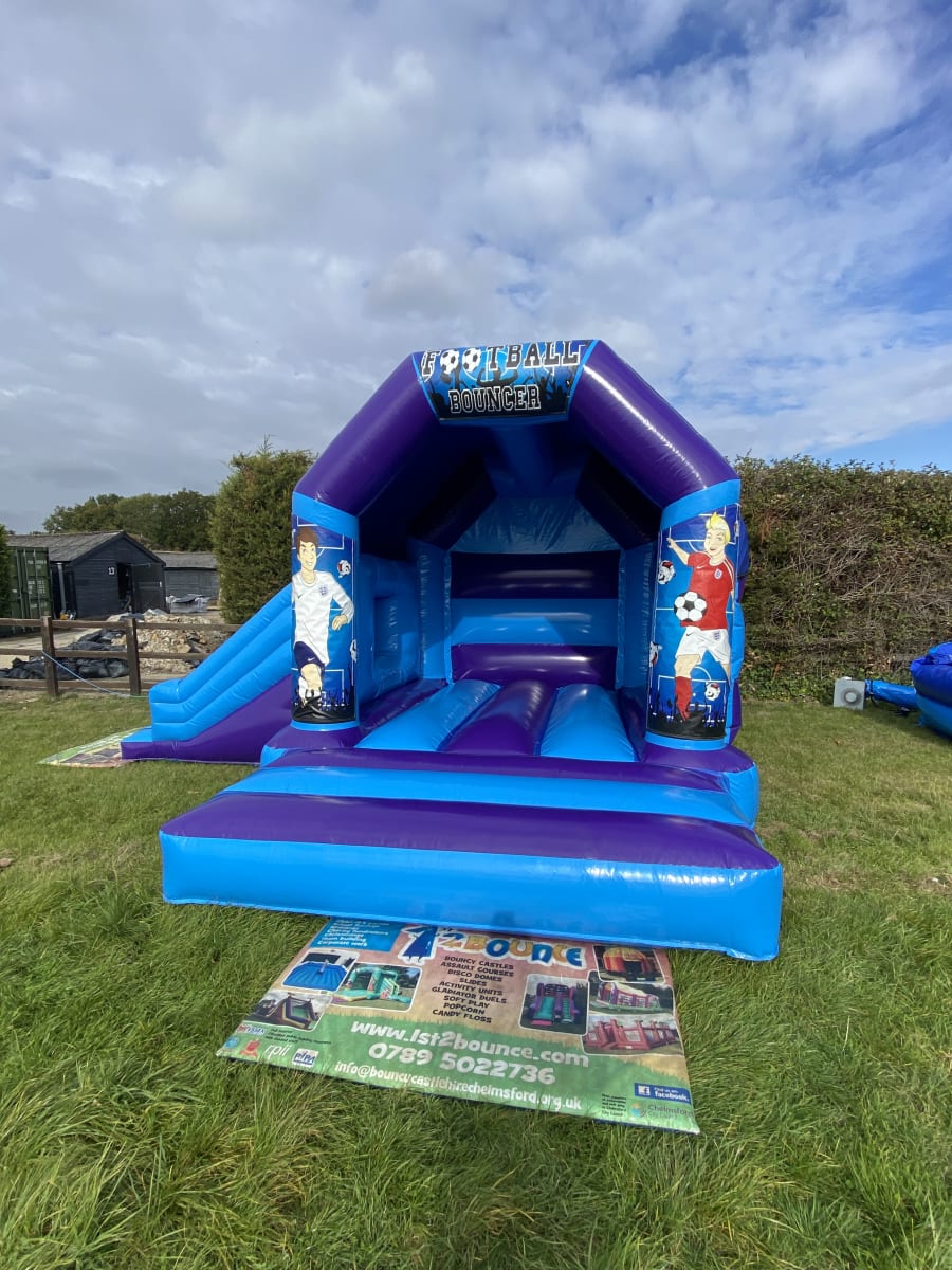 Lace up your boots and put on your favourite football shirt as the game is about to kick off with our amazing Football themed bouncy castle new in to our fleet made in a stunning high gloss material and with brightly coloured football artwork and with the added feature of a slide coming out from the side this really is the championship winning experience for any football crazy guests at your party or event . We can also offer one of the largest ranges of sports inflatables to hire in Essex from penalty shoot outs to table football hire , basket ball , cricket , darts and even golf we got you covered to see our full range on our sports inflatables to hire page . Although we are a Chelsmford based inflatable hire company our vans do cover most of the towns and villages around Essex just CLICK HERE to see if we cover your area or call one of the match officials on 07895022736 . Looking to send the game into extra time then thats not a problem as we offer an overnight hire service for a small extra charge , many clients like to add other items to their football party or event so with this in mind we have a dedicated packages page where you can find some fantastic money saving deals or just CLICK HERE to email our office and we can custom build a package to suit both your budget and hire needs . Want a few smaller items to add to your booking then have a look on our extras page for some low cost ideas such as space hopper hire , side show games and even giant connect 4, Its not just football bouncy castle hire we have to offer we can provide a wide range of assault course hire , inflatable slides , adult bouncy castles and even soft play hire for the younger guests at your party or event and in a wide range of themes such as pirate inflatables , princess bouncy castles , dinosaur and even super hero inflatables . All bookings can be made online 24 hours a day 7 days a week using our online diary and booking system and you can even book multi day hires for a full weekend of bouncing fun .