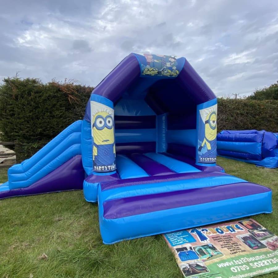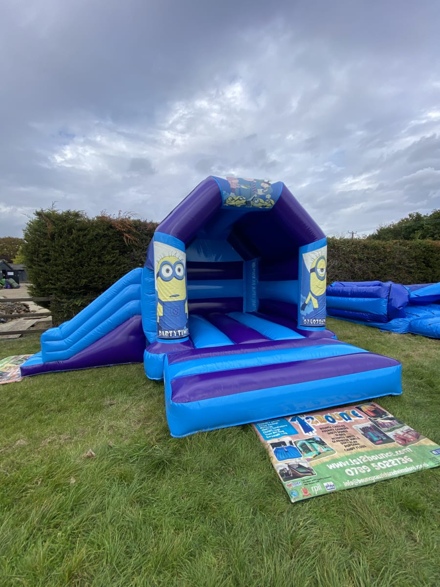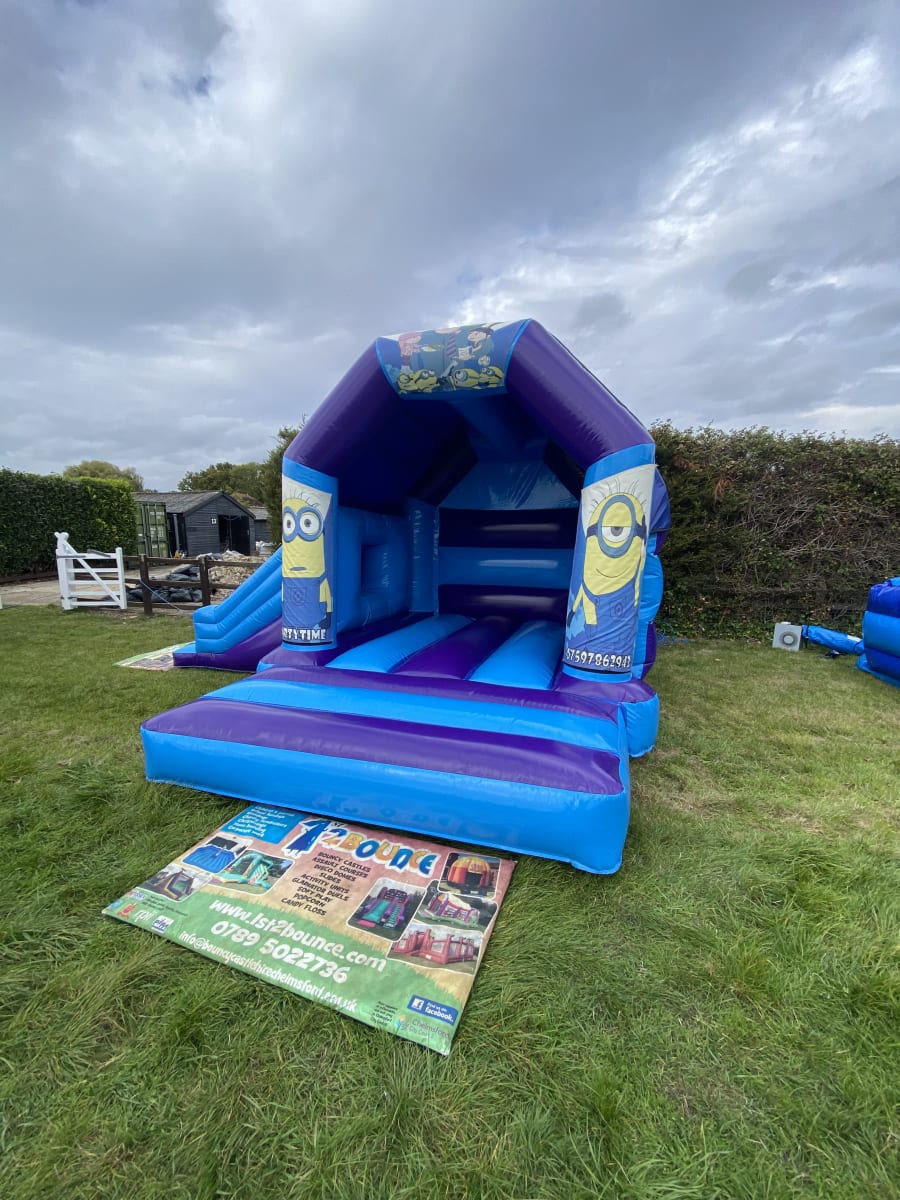 Looking for minions themed party ideas then why not bring along our favourite characters Dave , Kev , Bob and Gru from the smash hit movie Minions with our amazing side slide minions bouncy castle available to hire in Chelmsford and all surrounding areas . Made in a high gloss material and with bright and colourful minions artwork this really will be the star of the show at your party or event and with the added twist of having a slide coming out from the side your little minion fans will be kept entertained all day long or should you wish for your party to go on in to the night or even for a few days then we offer both overnight hire and discounted multi day hire all of which can be done on your booking form . If your garden space might not fit this castle due to it's width we also have a front slide and normal minions bouncy castle all of which have built in sun and rain covers so not even the good old English weather wont stop your party or event . Looking for something for the younger guests then we have a wide range of soft play to hire in Chelmsford and for the older more adventurous then why not check out our fleet of adult bouncy castles , inflatables slides and assault courses . Many of our clients look to book more than one hire item so with this in mind why not look on our dedicated package page for some fantastic money saving ideas or CLICK HERE to email our office and we can custom build you a package to suit both your budget and hire needs . Although we are a Chelmsford based inflatable hire company our vans do cover a very wide area supplying bouncy castles in Essex from Billericay and Brentwood inflatable hire to Maldon and Wickford to check we cover your area just CLICK HERE to see our areas covered page or call one of the team on 07895022736 and we can give you a price for out of area including full U.K. deliveries . All bookings can be made 24 hours a day 7 days a week using our online diary and booking system just select your hire items and date to check they are available then if they are just hit book now and fill in all your details it really is that easy and stress free to book your minions bouncy castle hire in Essex when using our company .