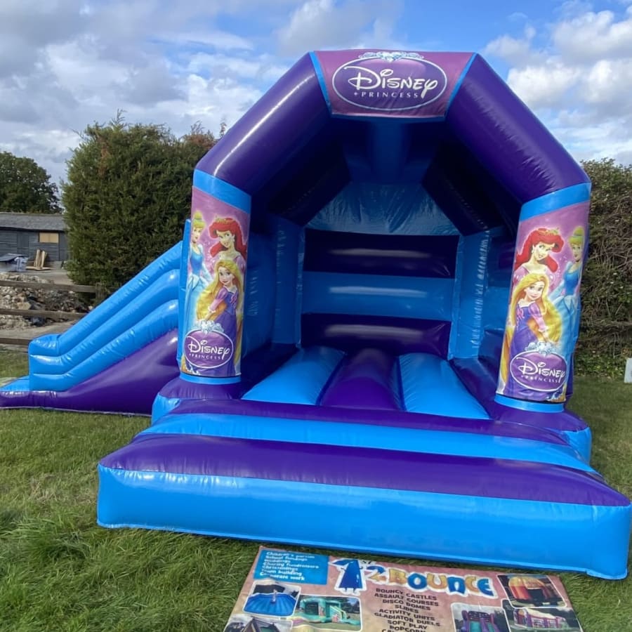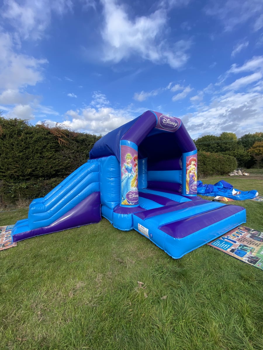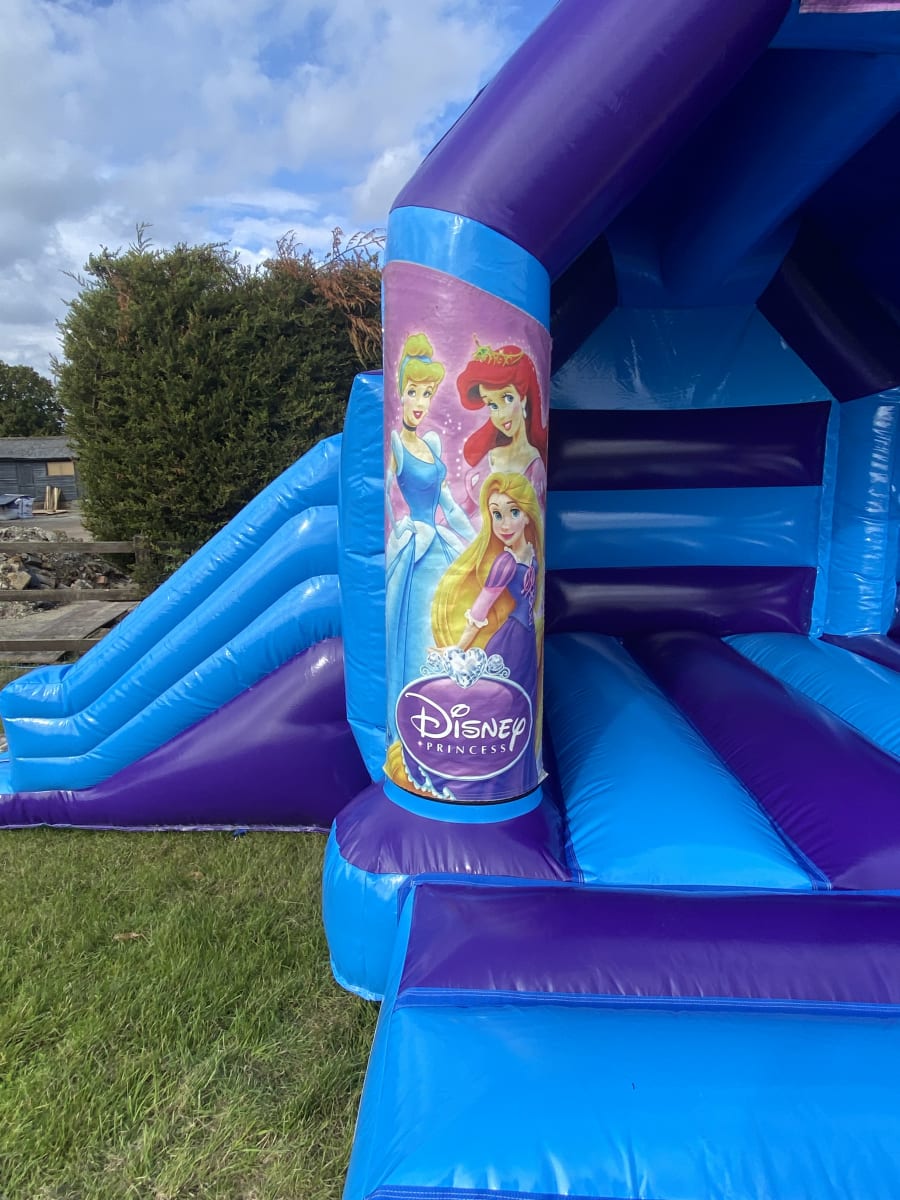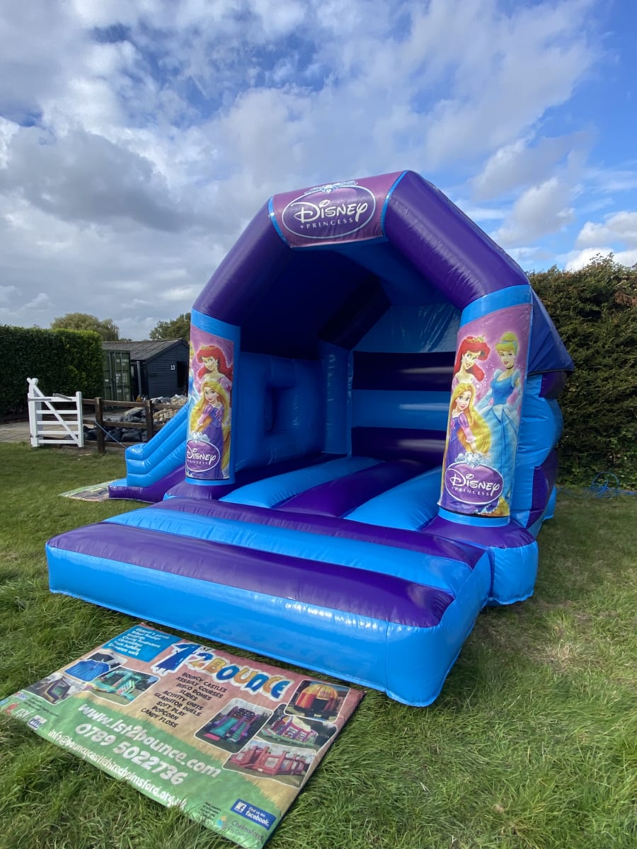 Its every girls dream to be a princess and with this amazing princess bouncy castle to hire in Chelmsford we can make your children's dreams come true , made in a high gloss material and with bright and vibrant artwork featuring all of disneys most popular princesses this will certainly ensure your children will go to the ball and meet their prince charming , and with the built in rain / sun cover not even the good old British weather will stop the party going ahead . This bouncy castle has a standard bounce area but also has a slide coming out from the side to make the ultimate princess party experience , If you want your princess party go on in to the night or even for a few days then we offer both an overnight hire option and discounted rates for multi day hires both of which you can add to your booking form when you place your order with us . If this princess castle wont fit into your garden area we have many other bouncy castles to hire in the princess theme some with slides on the front and even disco princess bouncy castles just see