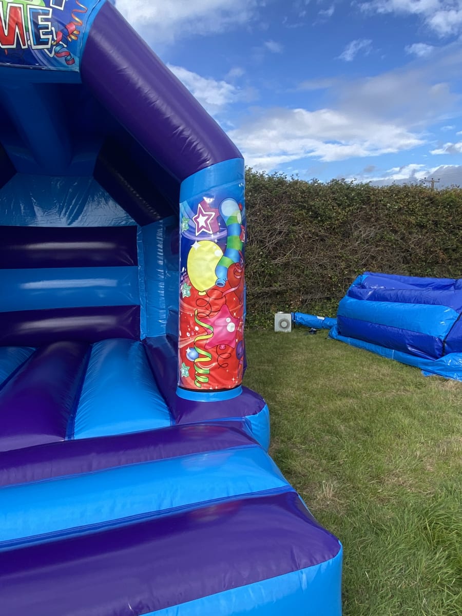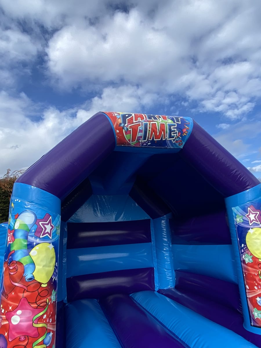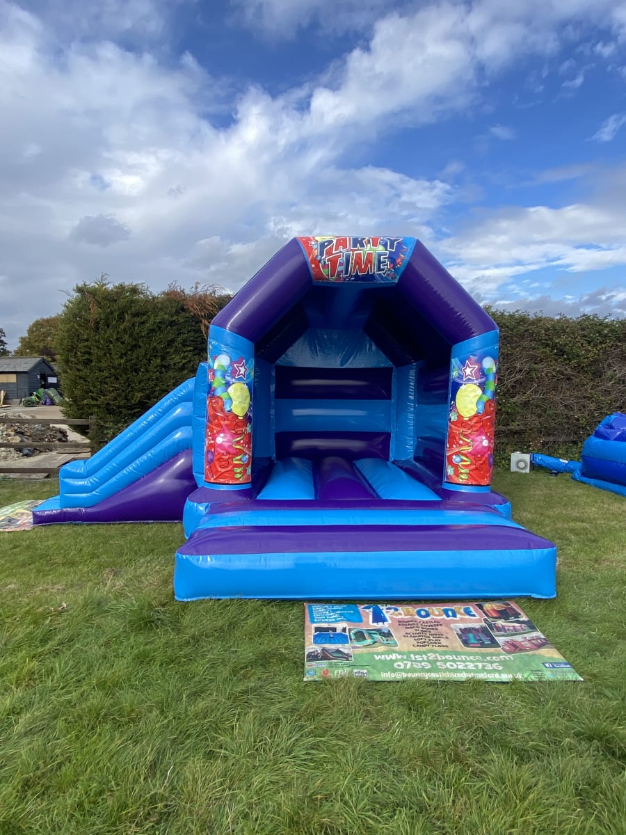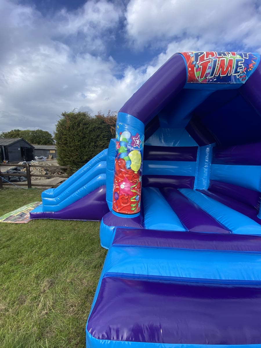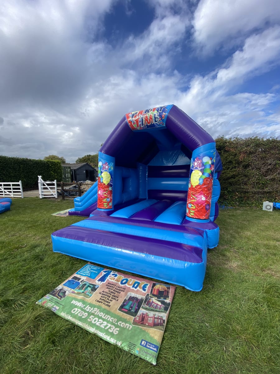Planning a special event at a venue or in your garden and would like some entertainment for the younger guests but stuck for ideas then we have this amazing Gender neutral Party Time slide bouncy castle available to hire in Chelmsford and surrounding areas , this inflatable has been made in a stunning high gloss material and comes with a built in sun / shower cover and with the added twist of a slide coming out from the front this really will look the part at any garden party or event keeping your guests entertained all day long . Want the party to go on in to the night or even for a few days then we offer both an overnight hire service and discounted hire rates for multi day hires both of which can be added to your booking form online . Unsure if this is the theme for you then we hold one of the largest ranges of