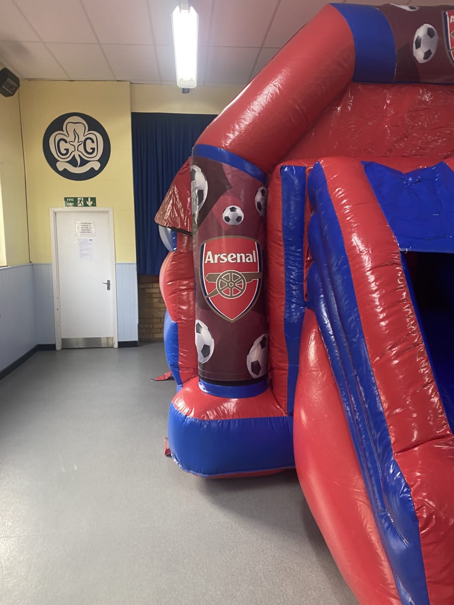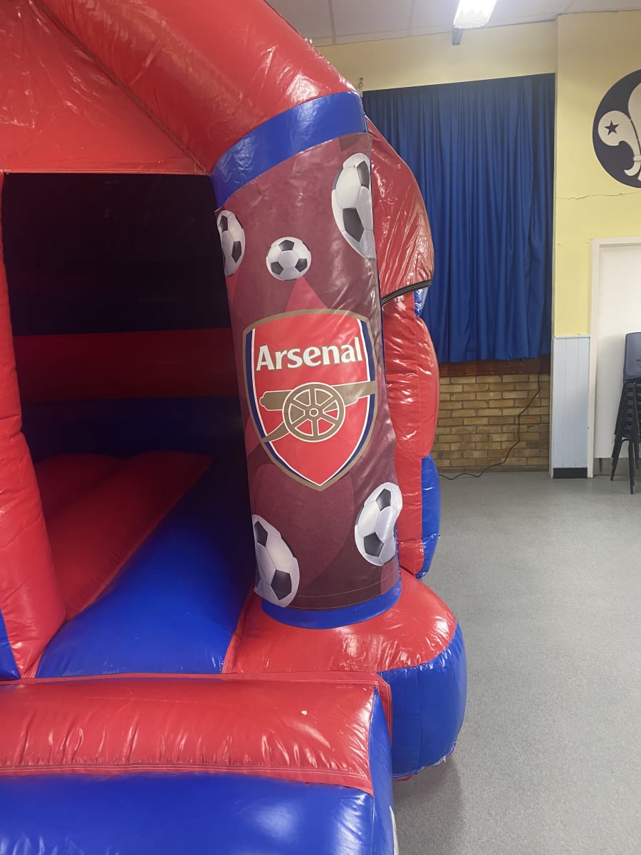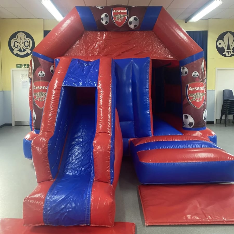 Are you or your children massive fans of the red and white North London Army better know as the Arsenal football club then we have the ultimate match day experience for your party or event with this amazing Arsenal front slide bouncy castle to hire in Chelmsford and all surrounding areas , equally as impressive as the emirates stadium this bouncy castle is made in a high gloss material and features the world famous gunners club emblem in stunning bright artwork and with the added twist of a slide coming out from the front your little football fans will bounce and slide right up to the final whistle , want the party to go into extra time or even all weekend then we also offer overnight hire and reduced rates for multi day hire which can be selected when filling in your online booking form .Want something for the younger guests then we also have a wide range of soft play hire and for the older guests why not look at some of our adult bouncy castles to hire in Chelmsford along with a wide range of assault courses to rent , inflatable slide hire and even high energy inflatables such as gladiator duels . Our company has one of the largest ranges of sports related inflatables to hire in Essex from basket ball shoot outs to table foot ball games , giant inflatable darts and inflatable penalty shootouts all can be found on our sports page . Many clients look to book more than one item for their party or event so with this in mind why not look on our dedicated packages page or CLICK HERE to email our office and we can custom build you a party page to suit both your budget and hire needs . Although we are a Chelmsford based bouncy castle hire company our vans cover many other areas across Essex supplying inflatable hire to Billericay , Brentwood , Wickford and Maldon just CLICK HERE to see our areas covered page or call one of the team on 07895022736 and we can give you a quote for other areas including full U.K. delivery . Booking your Arsenal bouncy castle hire has never been so easy using our online diary and booking system just select your hire item and date to check they are free then if they are just hit book now and fill in all your event details it really is that easy and stress free to bring the match day experience to your home when using 1st 2 bounce for your party or event .