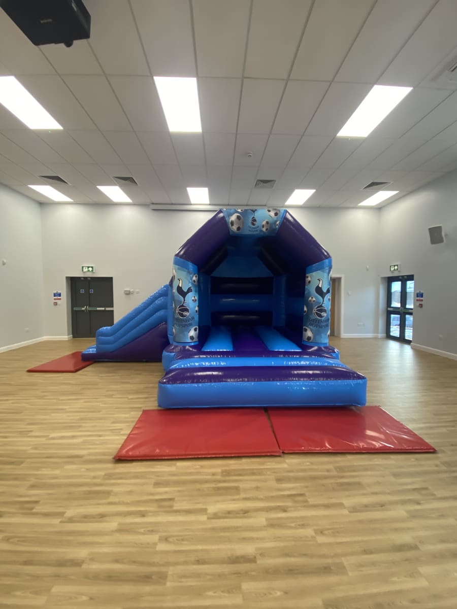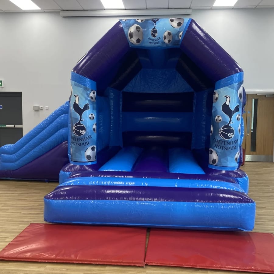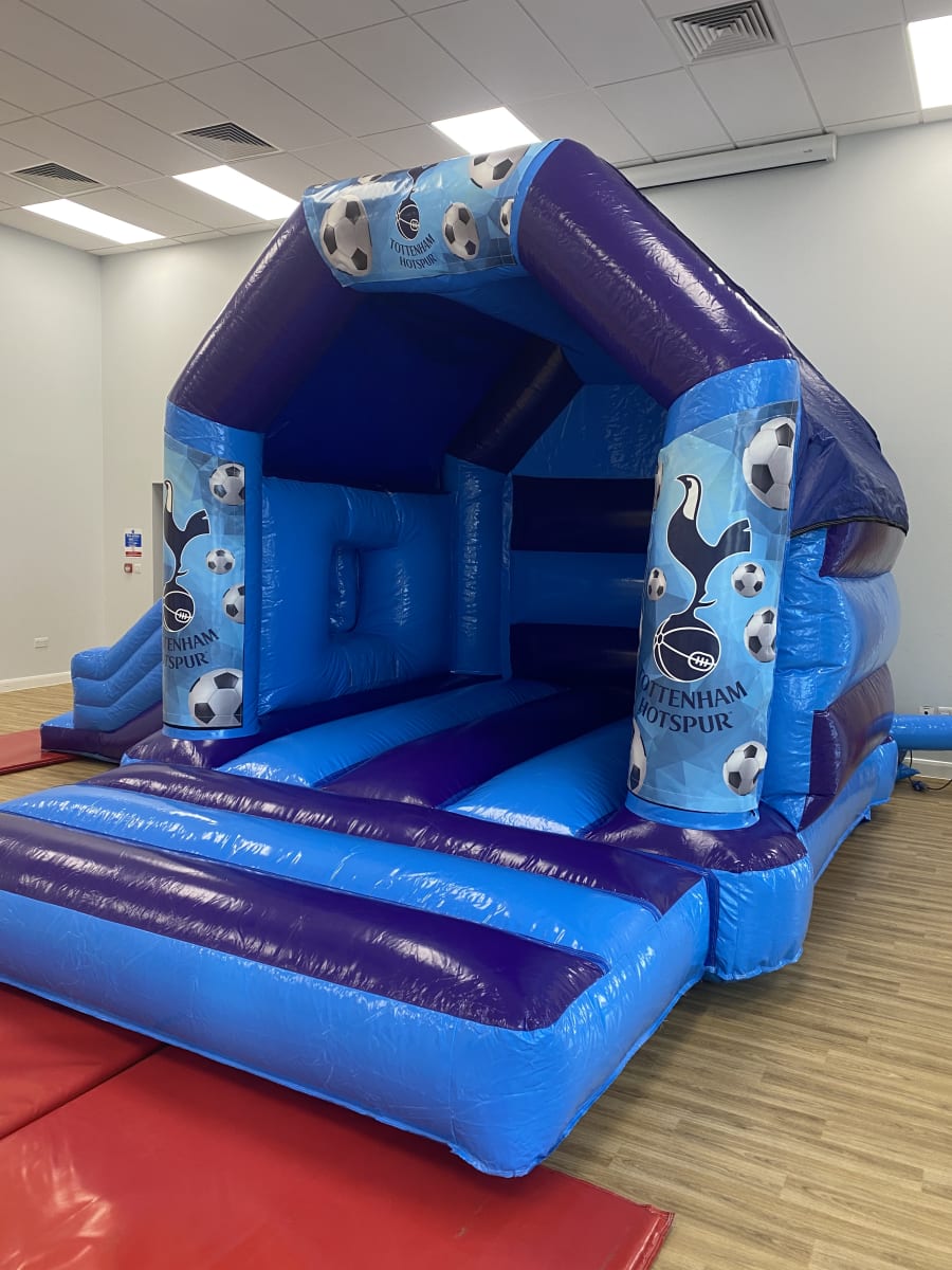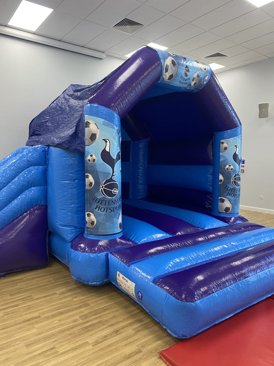 Are your children fans of the famous Tottenham football club and would love to have them come to your very own party well we cannot unfortunately bring Harry Kane and his fellow lillywhites but we have the next best thing with our amazing Spurs bouncy castle available to hire in Chelmsford and all surrounding areas , Made in a stunning high gloss material and with the North London Clubs emblem all over the front of the inflatable this really will bring the magic of white hart lane to your very own back garden or venue . This Tottenham bouncy castle we have to hire has some extra special features added to it like a built in sun / rain cover to stop the weather calling the big match off and with a slide coming out from the side your children can not only bounce but also slide around till the end of the match or if you would like the party to go in to extra time or even for a few days then we can offer both an overnight hire option as well as discounted multi day hires which you can select online when placing your booking . You might also want to book more sports hire items such as our penalty shootouts , table football games or even basketball inflatables all of which can be found on our