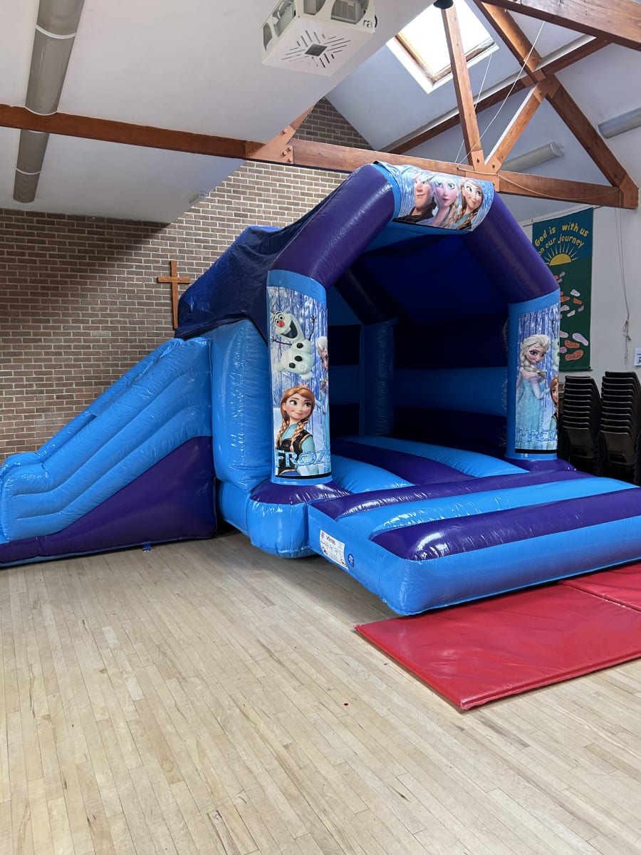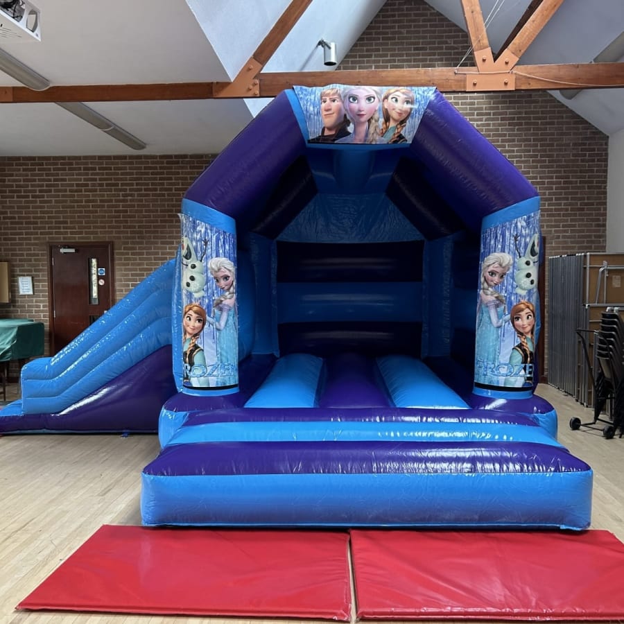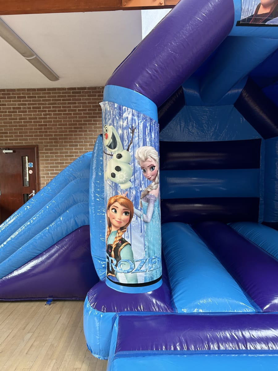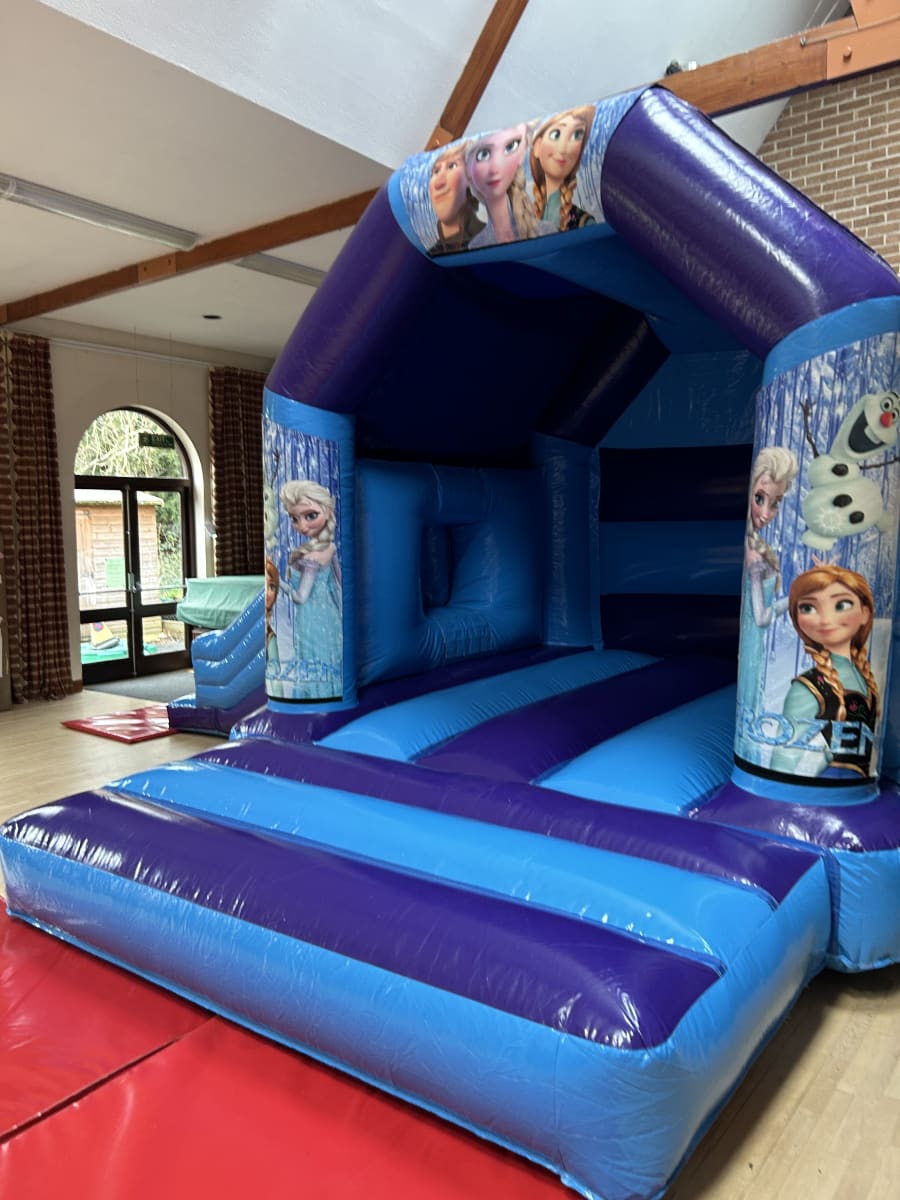 One of our most popular themes of bouncy castles to hire for girls has for a long while been Frozen and if you are looking for Frozen party ideas in Chelmsford then look no further with our amazing Frozen slide bouncy castle available to hire in Chelmsford and all surrounding areas , made in a high gloss material finish and with stunning artwork with the smash hit movies top characters Elsa , Anna and the adorable snowman Olaf and many other this really will bring the magic of the movie to your very own party or event and with the added features of a sun / rain cover to ensure the party will go ahead in most weathers and with a slide coming out from the side you little ones will be kept entertained all day long or if you wish your frozen party to go on in to the night or even for a few days then we offer both overnight hires and discounted multi day hires both of which can be added on your booking form . Want something for the younger frozen fans then we have a wide range of