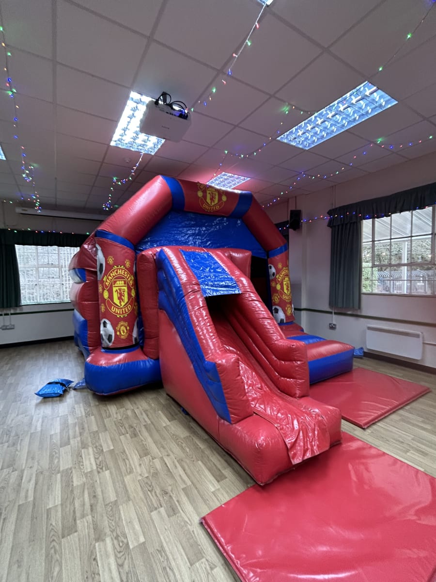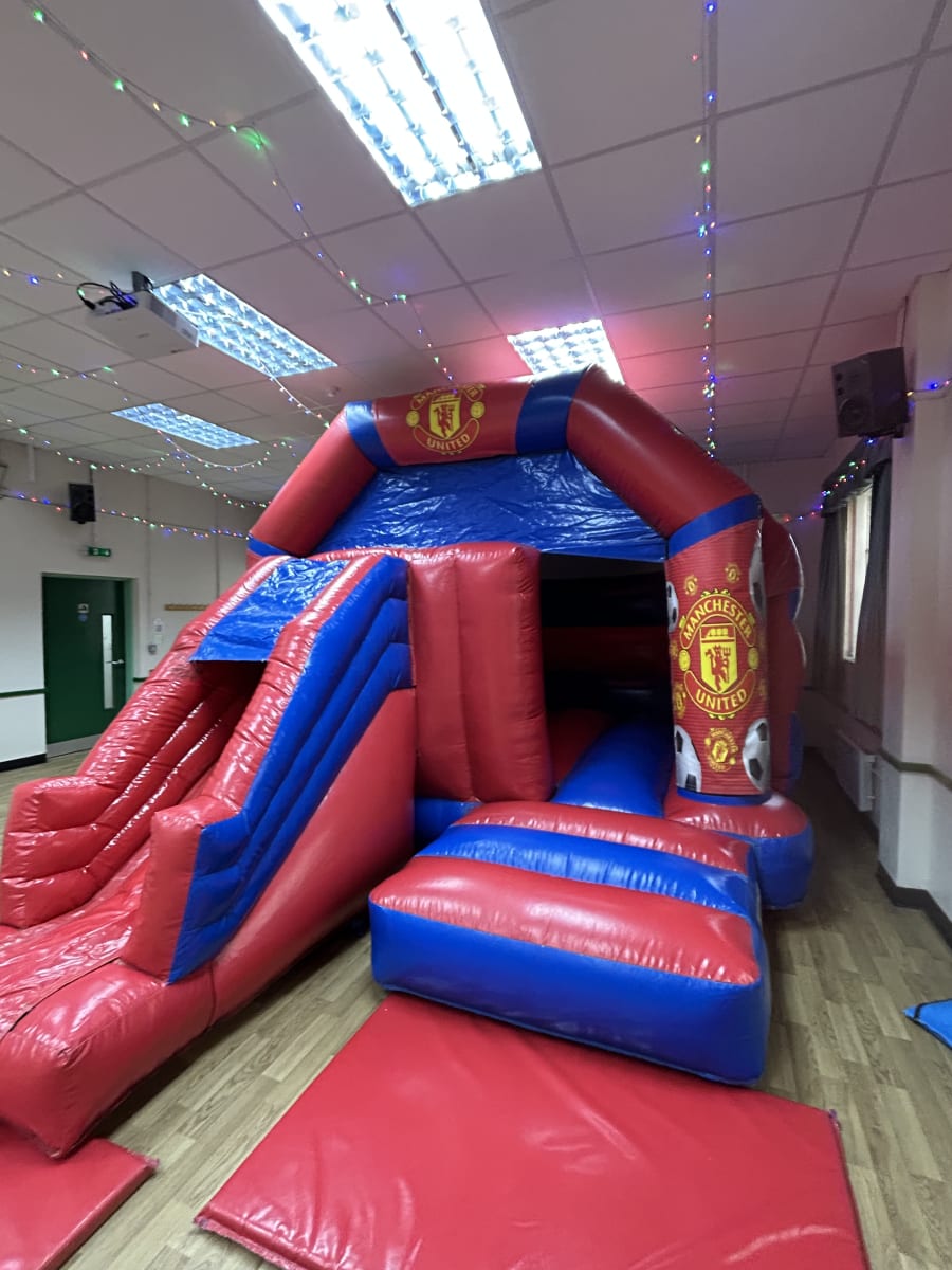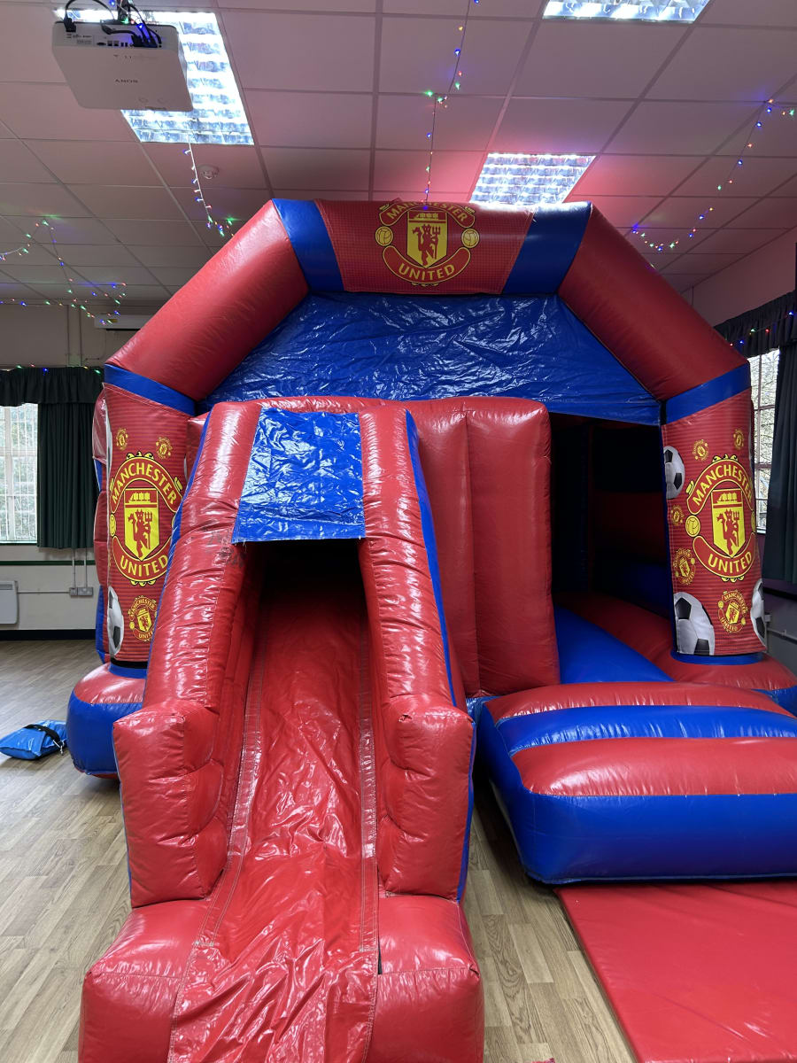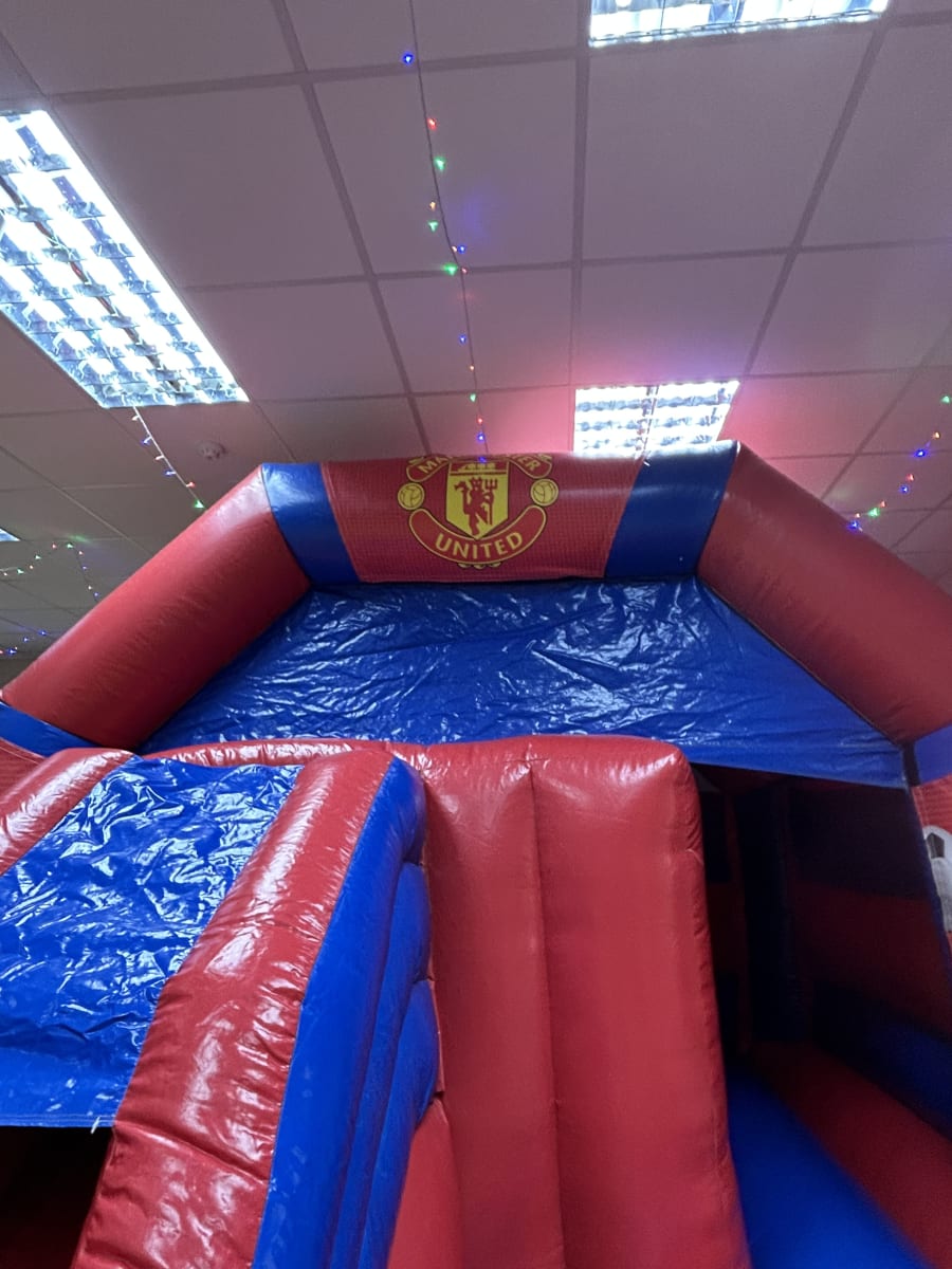 Think of the most played sport in the world and your think football then name one of the biggest teams in the land and you will probably say Manchester United having won every major honour in the games history and with a world wide fan base to be matched by no one we are delighted to now have this fantastic looking Manchester United bouncy castle available to hire in Chelmsford and all surrounding areas made in a high gloss material and having a built in sun / rain cover and of course having the famous club emblem all over the front this really will bring the Old Trafford experience to your very own event venue . This Manchester United bouncy castle also has the added feature of a slide coming out from the front making it a great inflatable for the more narrow gardens that can't fit one of our side slide inflatables in but will be guaranteed to keep your young football fans entertained all day long or if you wish to party in to the night or even a few days then we offer both an overnight hire option and discounted rates for multi day hires both of which you can add to your online booking forms . If you wanted other football related ideas then we have one of the largest selections of sports inflatables to hire in Essex which can all be found on
