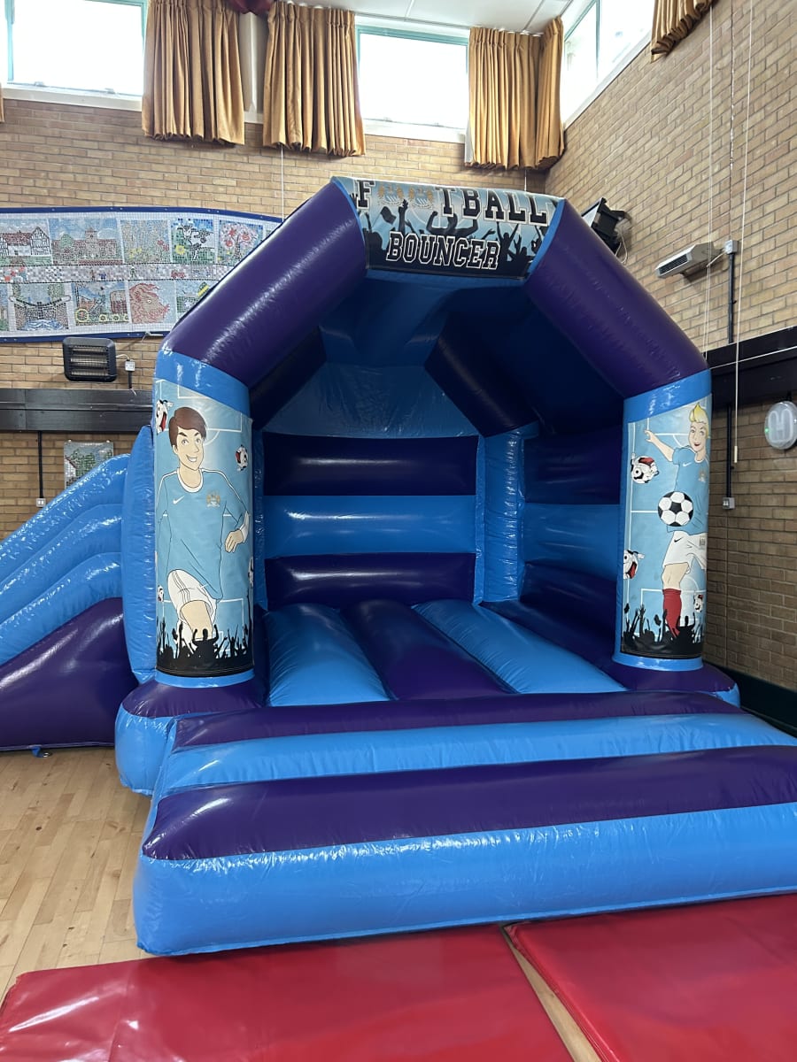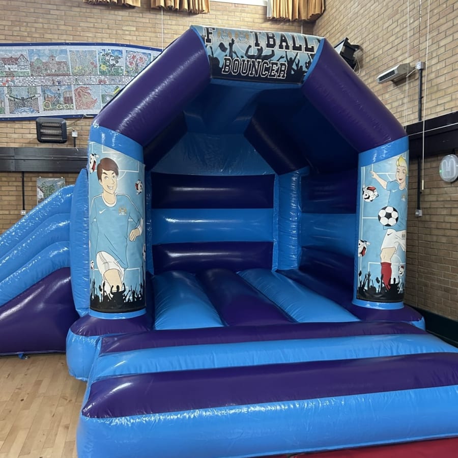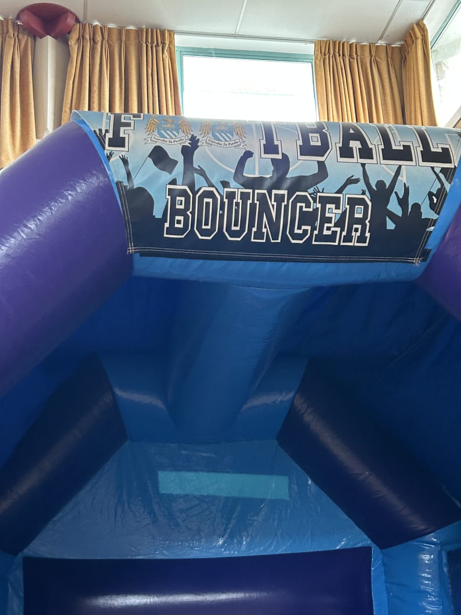 Bring the magic of the Etihad stadium to your very own back garden with our brand new Manchester City bouncy castle to hire in Essex , made in the club colours and with a built in weather cover this inflatable really will make your little Man city fans day as they dream of being the next Jack Grealish or Erling Haaland while they bounce the day away and with the added feature of a slide coming out from the side the entertainment value on this bouncy castle is a guaranteed match winning event for any football party in Essex . Want the party to go on in to extra time or even a replay the next day then we offer both an overnight hire service and discounted rates for multi day hires both of which can be added to your booking form online . Looking for other football party ideas in Essex then we have some great ideas such as inflatable penalty shoot outs , side show football games and even inflatable air football games all of which can be found on