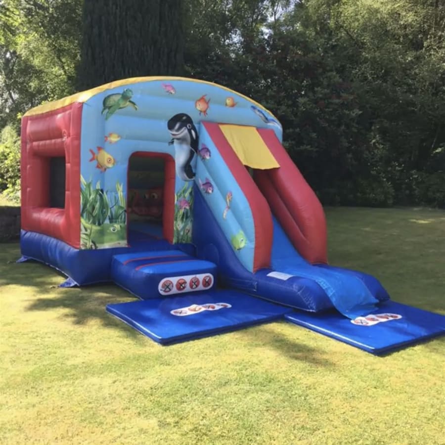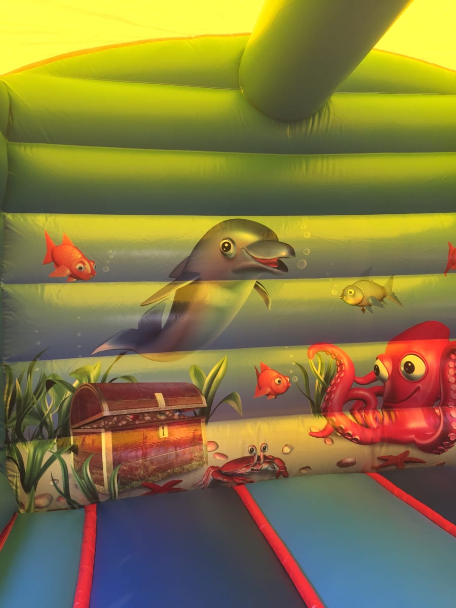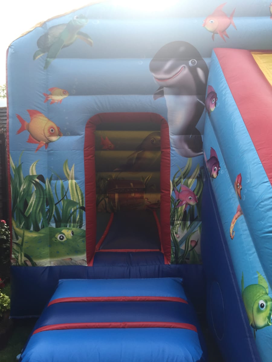 New to the fleet is this stunning slide castle to hire,built to full uk safety standards this inflatable has the best of both worlds with a 12x12 bounce area and a slide coming out from the front of the castle it takes up the same space as a standard bouncy castle so even the narrower gardens will be able fit this bouncy castle in, the artwork on this bouncy castle is simply stunning set in an under water theme your children will surely love exploring the depths of the ocean while having loads of fun bouncing and sliding,and with a sewn in roof to side walls this really is the ultimate in child safety.Not sure if any of our inflatables will fit your garden then simply