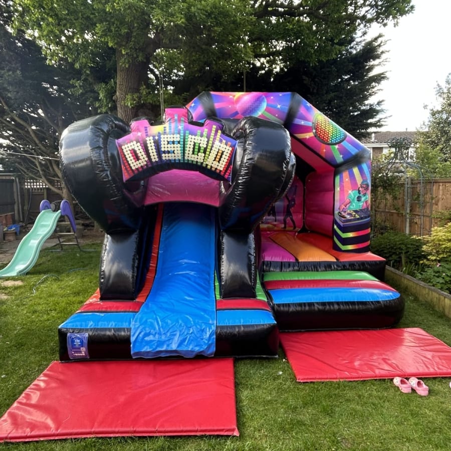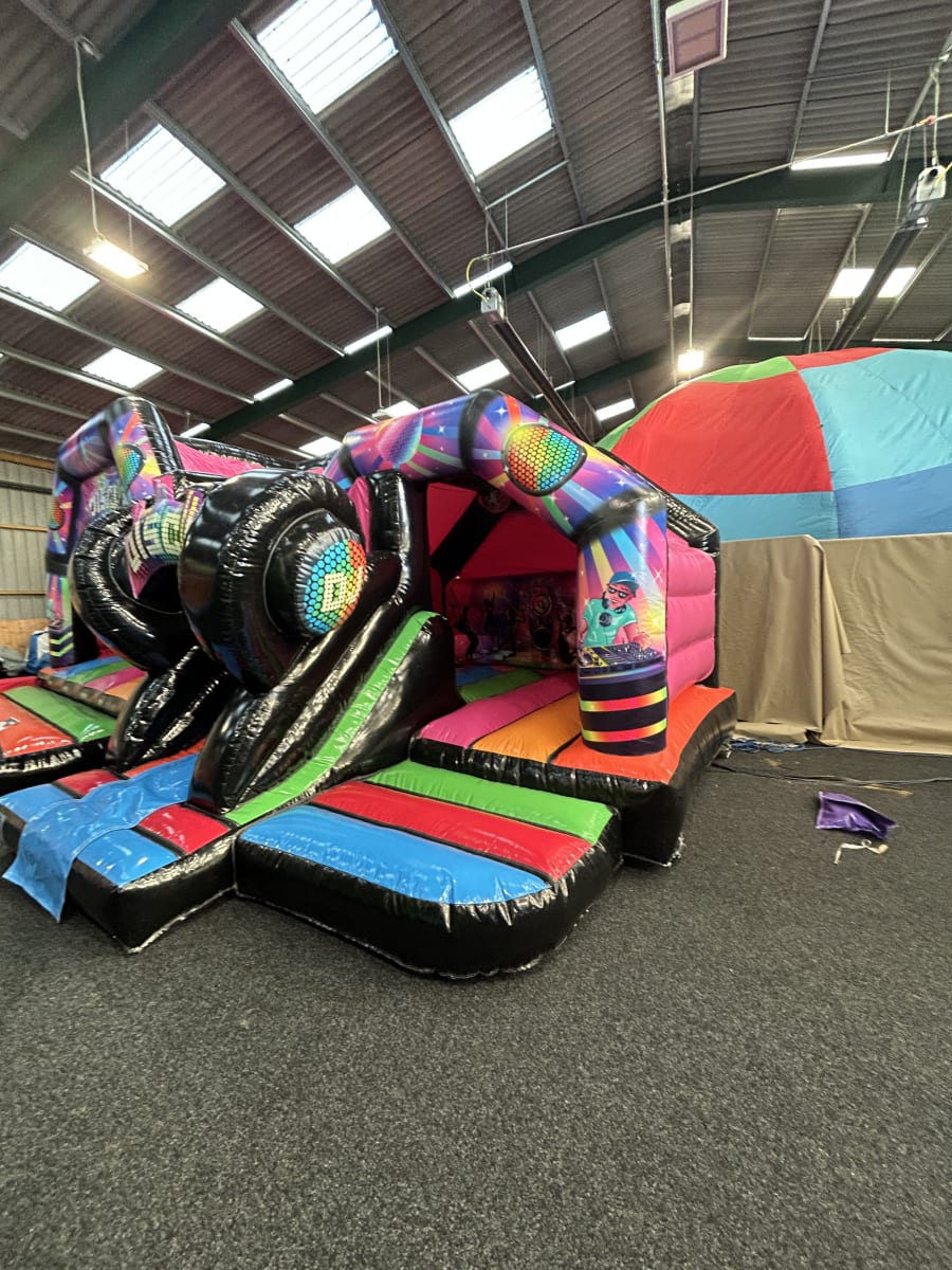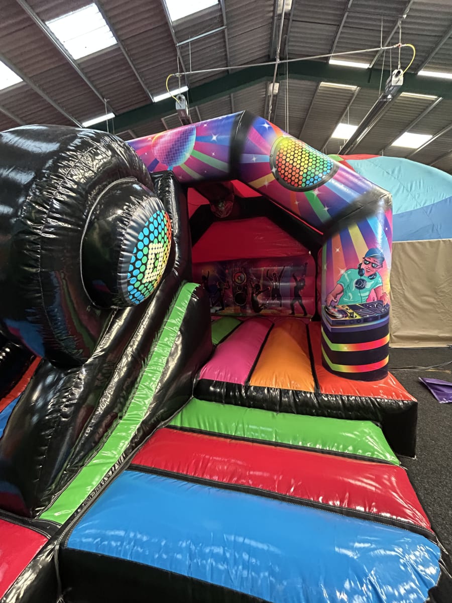 Unsure if you want to book a slide bouncy castle , disco dome or a normal bouncy castle then we have the perfect answer as we have combined all 3 in to this amazing custom built 3D Disco slide bouncy castle available to hire in Chelmsford and surrounding areas , Made in stunning and colourful material we really think this is the stand out show stopping inflatable we had in mind when we had this designed and for the finishing touch we had the slide made into a giant set of head phone speakers for the ultimate wow factor at any party or event . This inflatable comes with a built in sun / rain cover , Fitted disco lights and a powerful blue tooth speaker so your guests can bounce , slide and dance the day away or should you want your disco bouncy castle party to go on in to the night or even for a few days then we offer both an overnight hire service and discounted rates for multi day hires both of which you can add to your booking form online . Staying on the music theme we also have adult spec Disco domes to hire in Essex as well as inflatable night clubs and disco bouncy castles all of which you can find on our Disco and inflatable night club hire in Chelmsford page or call one of the team on 07895022736 for further advice or information. Want something for the younger guests then we have a fantastic range of soft play to hire in Chelmsford and for the older more adventurous the be sure to have a look at our full range of inflatable slides and assault courses we hire in Essex . Many clients look to book more than one hire product so with this in mind we have recently added a money saving packages page with some great deals on party packages should you not find a package you want then just CLICK HERE to email our office and we can custom built one for you to fit both your budget and hire needs and for some smaller finishing touches to your event such as giant space hoppers , garden games and even wiggle cars then it is worth having a look on our party extras page for some great ideas . Although we are a Chelmsford based bouncy castle hire company our vans do cover most towns and villages in Essex from soft play and bouncy castle deliveries in Billericay and Brentwood to Assault course hire in Wickford and Colchester to see our full areas covered page just CLICK HERE or call one of the team on 07895022736 for further afield delivery location prices . Booking your Disco bouncy castle hire in Chelmsford has never been so easy using our online diary and booking system just select your hire items along with the dates you require to check they are available then if they are showing as free just hit book now and fill in all of your event details it really is that easy and stress free to make your disco bouncy castle party in Essex one to remember when using our company .