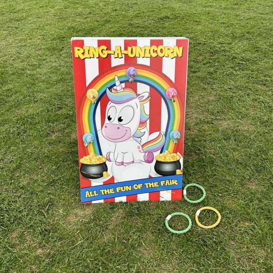 Another one of our fantastic side show games is our highly addictive ring the unicorn , players stand at a pre selected distance take aim and throw the 5 rope rings to try and hook on to one of the cute little unicorn heads winner is the person who scores the most . We currently have one of the widest selections of side show games from the classics like