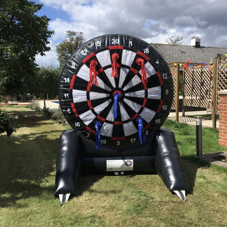Looking for something a little different to add to your party? well how about a twist on the common popular game of darts,step up to the line and throw your 3 velcro tipped darts at the board just like to original game.There are so many different games you can play from 501/301 down,round the clock and many many more this giant dart board is a sure way to ensure your guests are entertained throughout your event or party.This inflatable darts game is also a very popular attraction at weddings and also for corporate team building days