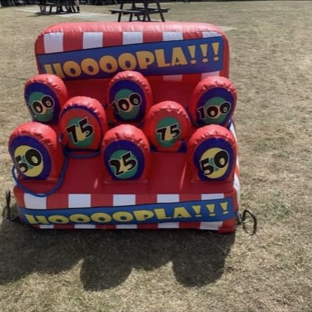 This side show game is a totally unique piece of equipment custom built for 1st2bounce inflatables a very simple yet addictive game where player toss 3 hoops at the hoopla and try and score the highest score they can, Great fun for all ages and a really good money maker for school fun days. Made in the traditional fun fair side show game colours this inflatable really does stand out at event,