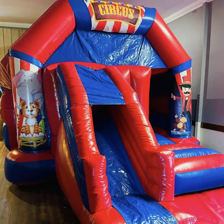 New in to our fleet is this stunning circus themed front slide bouncy castle made in a stunning high gloss material and with bright and vibrant artwork this really will bring the circus show to your party or event . Similar to a standard bouncy castle but with the added twist of a slide coming out from the front this will keep your party guests entertained for hours on end . We currently have one of the widest ranges of fun fair and circus themed inflatables anywhere in the U.K. from giant helter skelter slides to inflatable carrousels , side show games and even assault courses just CLICK HERE to see our full range . We not only supply bouncy castles but have a wide range of inflatable slides , assault courses , activity inflatables and even offer soft play hire for the younger guests . Although we are a Chelmsford based bouncy castle hire our vans cover most of Essex just CLICK HERE to see our areas covered or call one of the team on 07895022736 . Many of our clients book one than one item for their event so we also have a dedicated packages page which does offer some fantastic money saving ideas or just CLICK HERE to email our office and we can build a custom package to suit your event within your budget . Many of the questions and answers you may need to ask can we seen on our FAQ,s page , Booking your inflatable has never been so easy using our online diary and booking system just select your item and date to check availability then if it is free just hit book now and fill in all your details it really is that easy and stress free to bring the circus to your party or event .