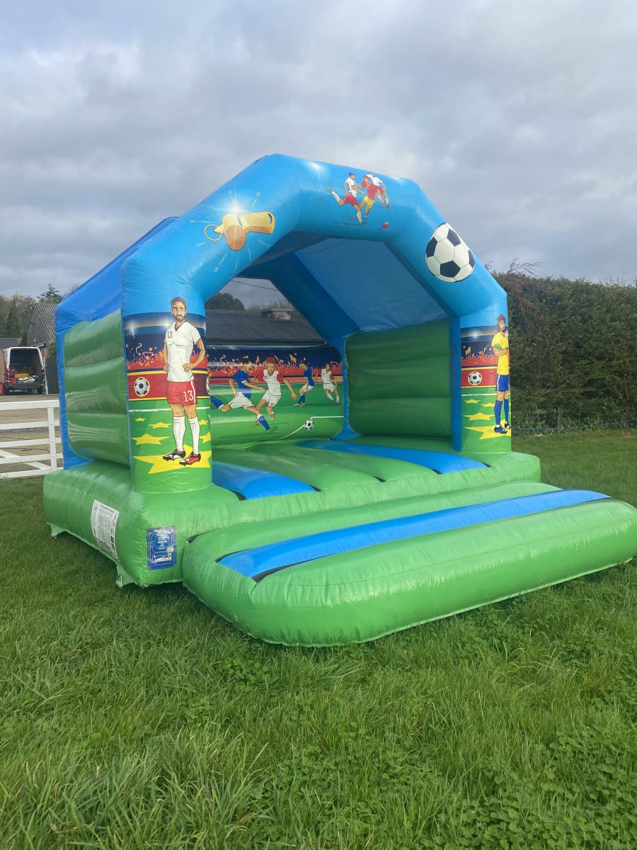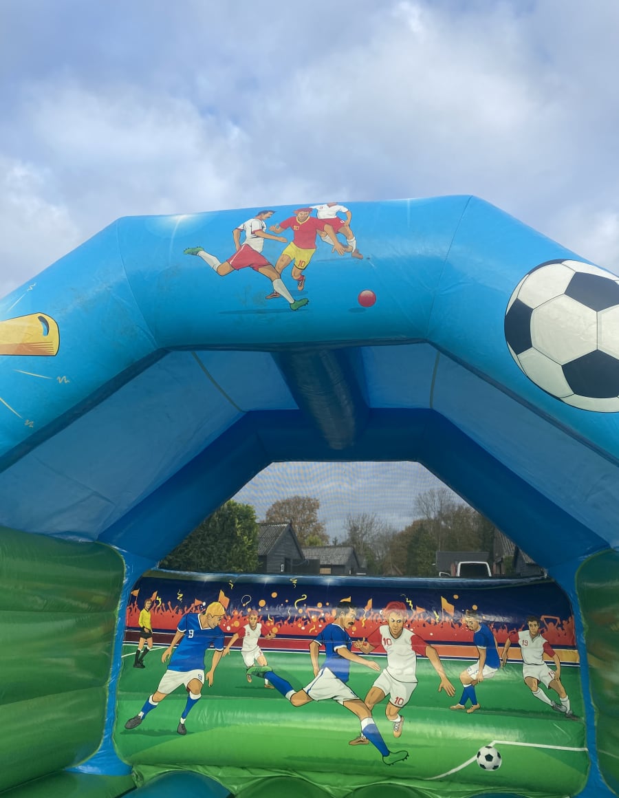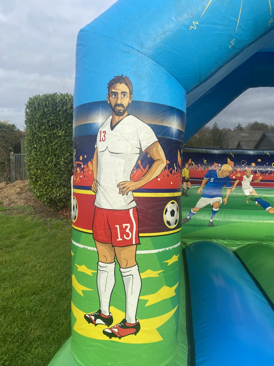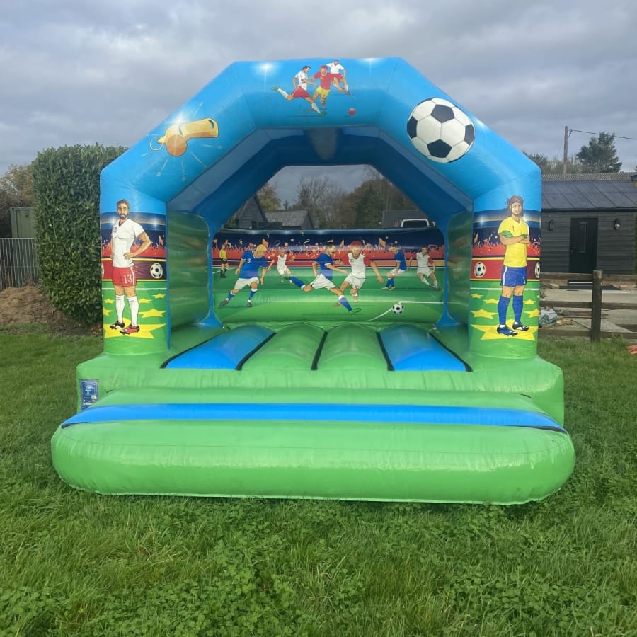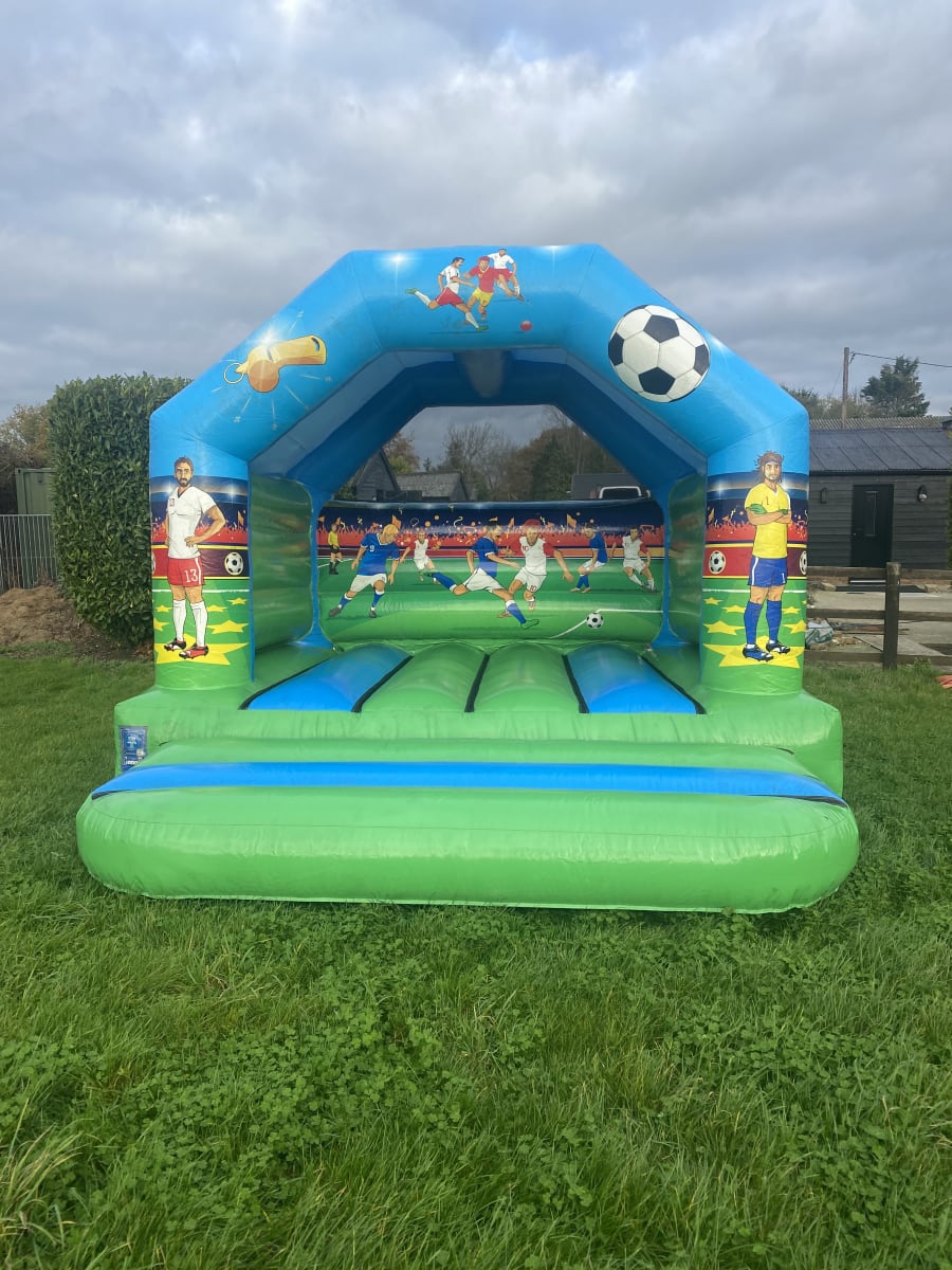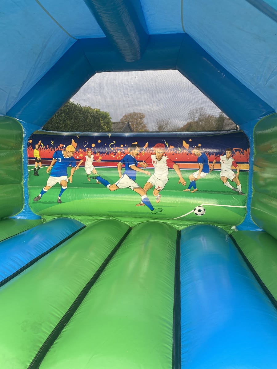 Are your children football crazy and want to bring the match day experience to your party then we have the perfect answer with our amazing Football themed bouncy castle , Made in a high gloss material and with stunning colourful artwork this really will make your football party or event a championship winning success , with Football being our national sport and possibly the most watched and followed sport in the world we have invested in one of the largest ranges of sporting inflatables to hire including football from penalty shootouts to football slide castles , air football games to standard football themed bouncy castles we really have a perfect squad waiting for your guests all of which can be found on our sports inflatables page. Looking to hire multiple items then check out our dedicated packages page for some amazing money saving deals like our football party package or our ultimate sports package to name but a few or just CLICK HERE to email our office and we can custom build you a sports package to suit both your budget and hire needs . Its not just sports inflatables we have to offer we also have a wide range of many other themes of inflatables from princess and pirate party ideas to disco castles and fun fair themed inflatables , soft play hire and large assault courses we really have got everything you need to make any party or event a winning result . Although we are a Chelmsford based inflatable hire company our vans cover a wide range of local towns and villages just CLICK HERE to see if we cover your area or call one of the team on 07895022736 and we will happily give you a delivery quotation . Booking your football bouncy castle has never been so easy using our online booking system just select your hire items and date to check availability then if they are free just hit book now and fill in all your details and we take care of the rest with options for overnight hire and even multi day hire at discounted rates it couldn't be anymore stress free when using our company .