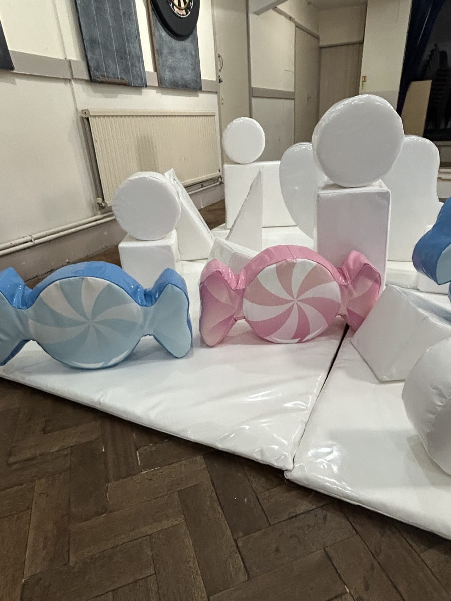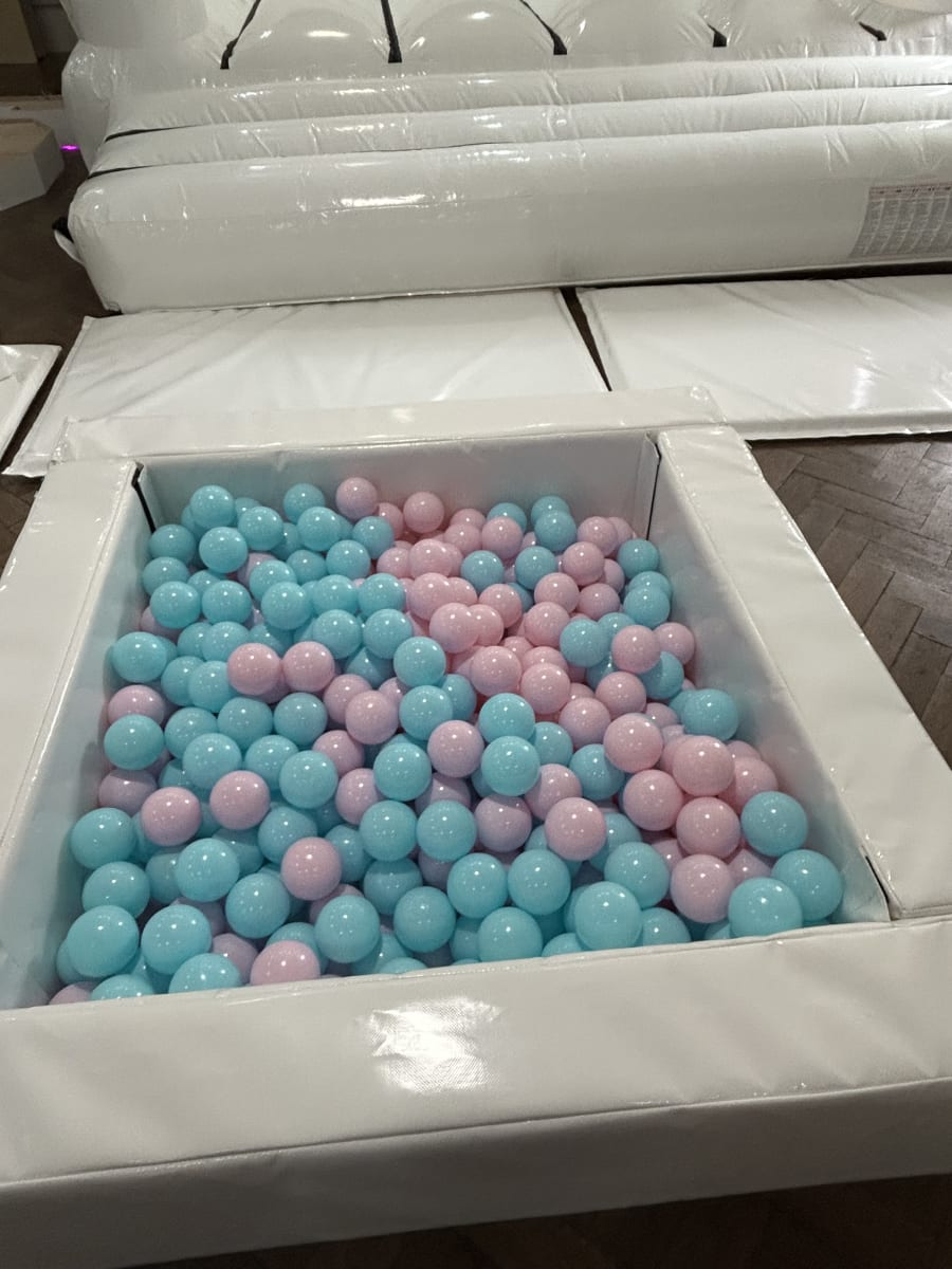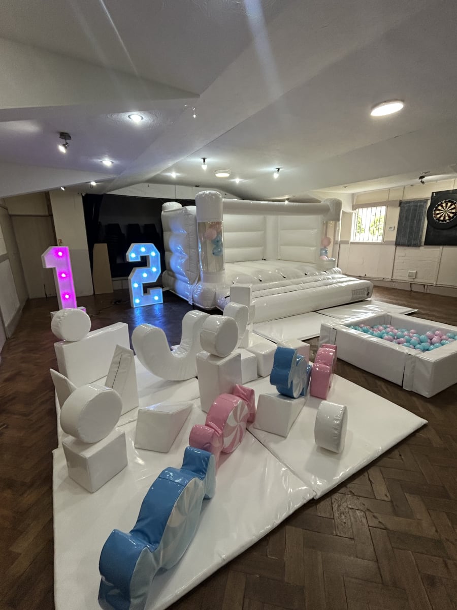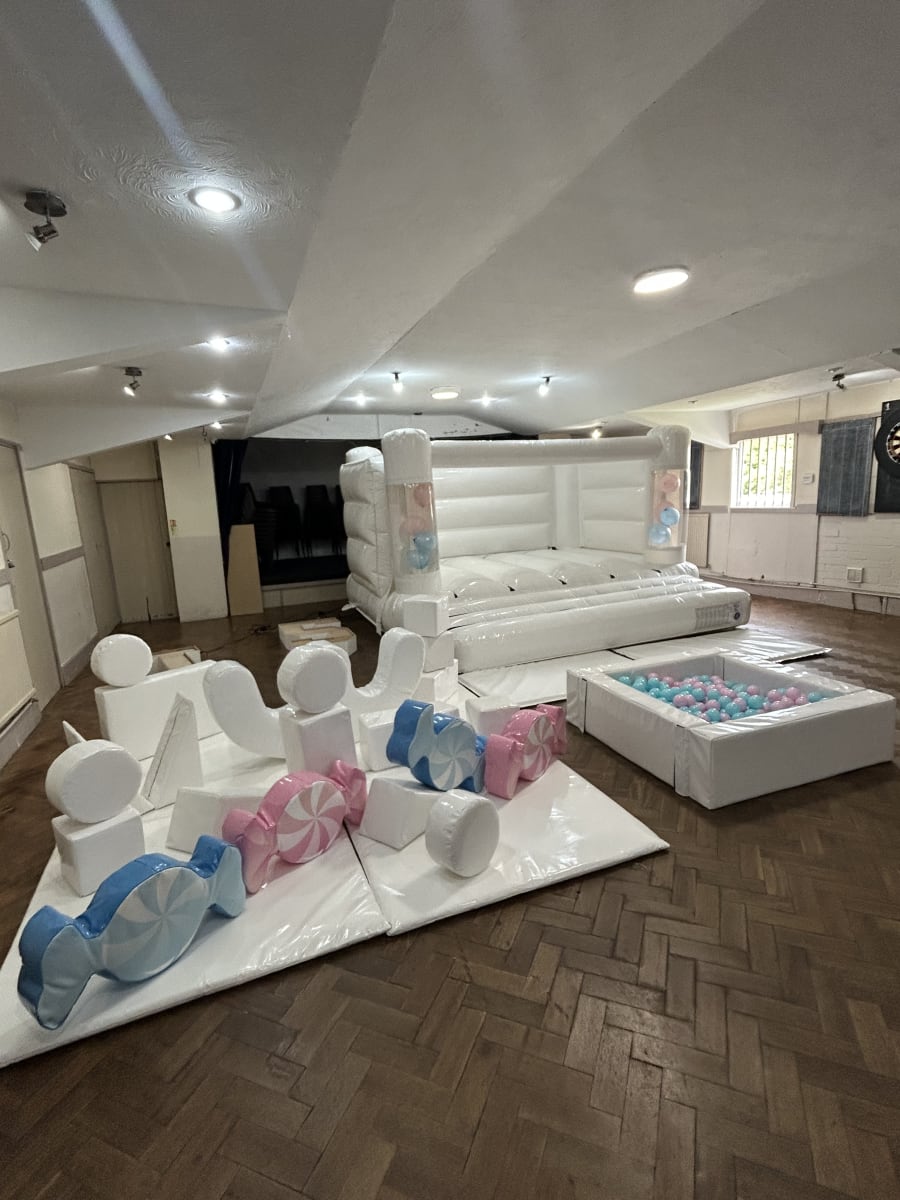 Looking for Christening entertainment ideas or a joint boy and girls party then we have the perfect solution with our white bouncy castle and soft plat hire set , This party package comes with 20 bits of high gloss white soft play 4 of which are giant candy sweets in both pink and blue add to that a matching ball pool with colour coordinated balls and for a finishing touch one of our beautiful white bouncy castles with balloon pockets in the front giving you the option to add matching balloons into the air jets within the castle for the ultimate wow factor . Want an extra special added feature then we also have