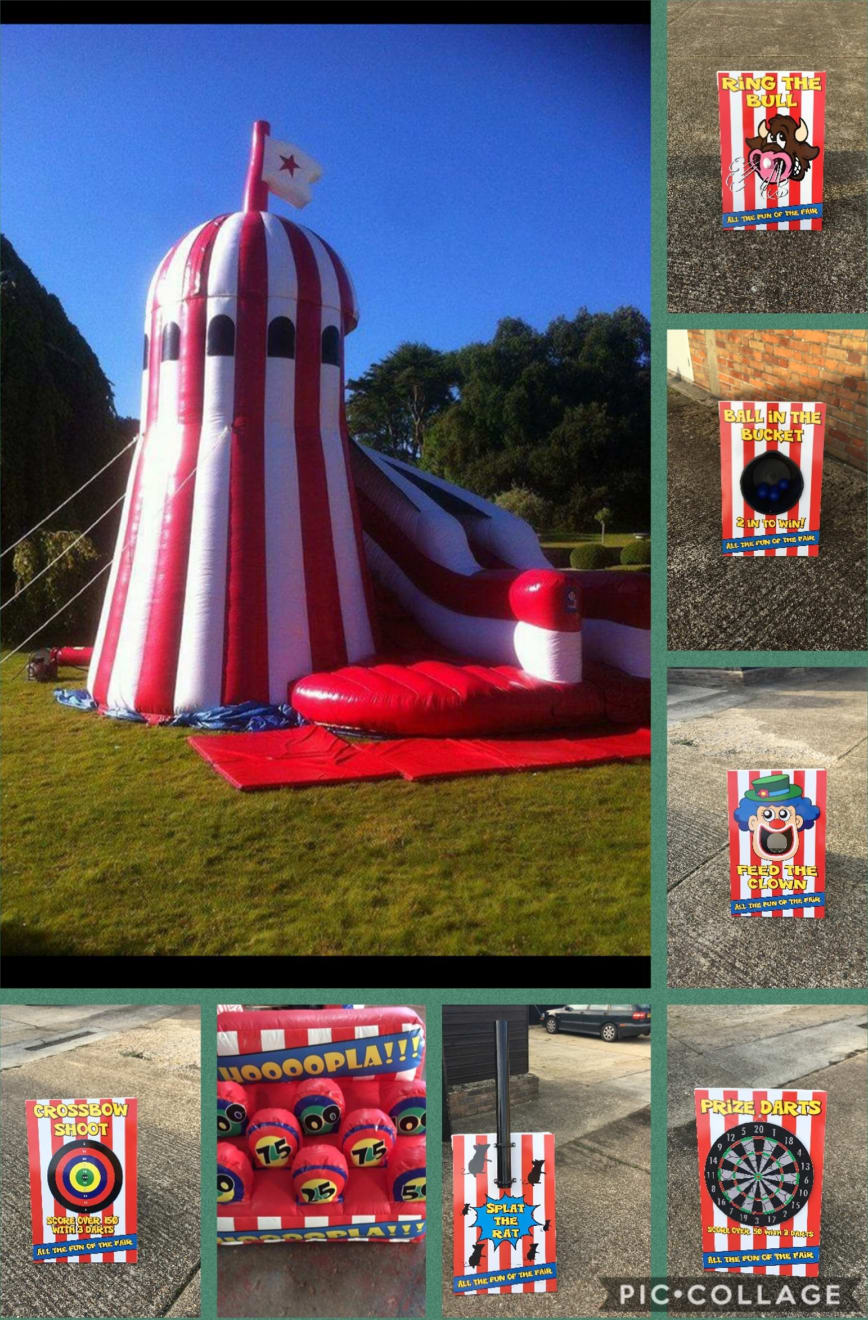 Looking for Funfair entertainment for your event then this money saving package is very popular with lot's of our clients featuring the stunning one of a kind inflatable Helter Skelter slide standing a whopping 28 ft in height this really will be a stand out feature at any party , wedding or corporate event as your guests climb the steps to reach the summit then whiz down the slide having all the fun of the fair and for those looking for a more chilled out day then this package also comes with 7 fun fair side show games including classics like splat the rat , ball in the bucket , ring the bull and even an inflatable hoopla for a full days entertainment experience , Should you want your party to go on in to the night or even for a few days then we offer both an overnight hire service and discounted rates for multi day hires both of which you can add to your booking form online . As well as this party package we hold one of the largest fleets of