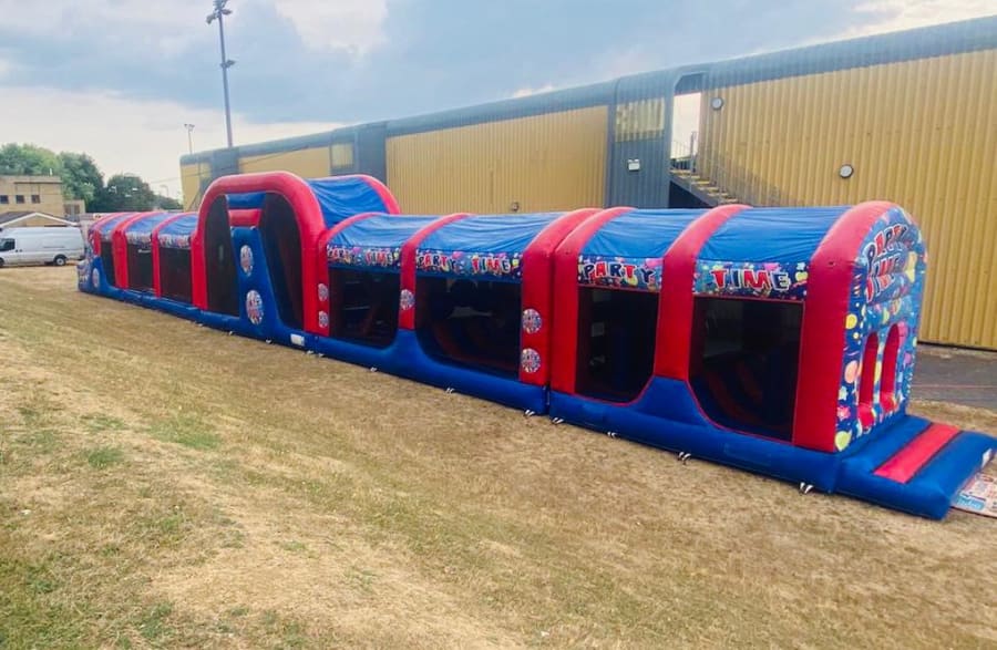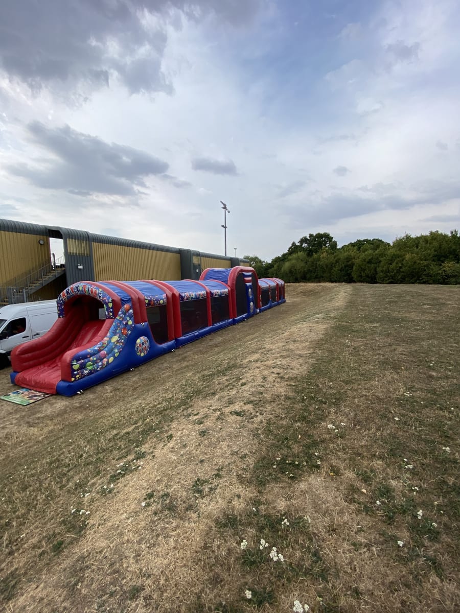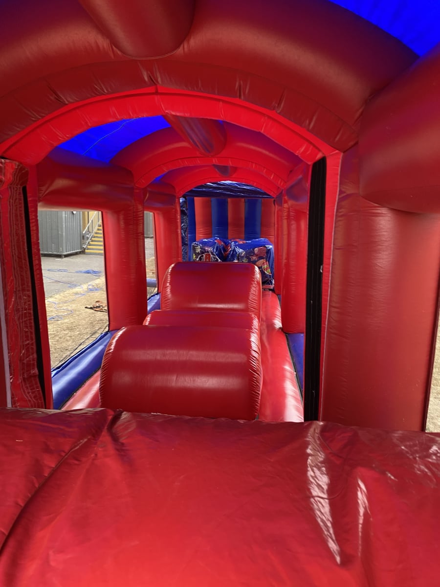 New on to our assault course hire fleet is our fantastic 150 ft long adult spec assault course one of only 2 of it's kind in the U.K. users enter the inflatable via 2 entry letter box holes then start the challenge ahead of them with speed ramps and Bish Bash inflatable posts you will then climb the steps to the top of the base jump section where you jump off in to a large air bag more often known as the leap of faith once getting back onto your feet you will be faced with the challenge of 5 large inflatable barrels to leap across one at a time just like in the hit show total wipe out then to end the run you will climb the steps to reach the summit of the slide section then whiz down to end the adventure. This inflatable is perfect for all occasions from garden party's , weddings , large events and very popular for corporate event hire , Should you wish us to supply staff we can offer this service as well as overnight hire services and discounted rates for multi day hires all of which can be added to your online booking form . Many clients like to have additional inflatables along side this large inflatable assault course so why not have a look on