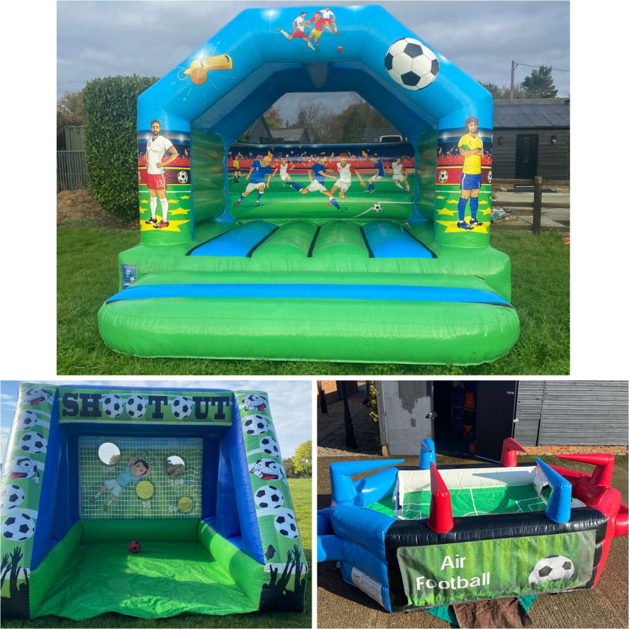 Looking for the ultimate Football party ideas in Essex then we have the perfect answer for your sports mad children with this Football party package we have to hire in Chelmsford and surrounding areas with these 3 fantastic inflatables , Firstly to get them in to the party spirit you get an amazing football themed 12x12 bouncy castle so they can bounce and party for the whole day until the match is over then for the children who dream of scoring the winning penalty in the cup final we supply one of our inflatable penalty shootouts with soft foam balls so they can home in their shooting skills and beat the keeper and then we also supply one of our favourite games we have on our hire fleet the air table football game where 2-6 players play a football game using air blowers to move the ball around the table and in to the back of the net , Who ever scores the most will be crowned the champions and can celebrate in style with chocolate cakes and fizzy pop ! . Want the party to go on into extra time or even over a few days then we offer both an overnight hire service and discounted rates for multi day hires both of which can be selected on our online booking form . Want something for the older more energetic guests at your party then we have a large range of