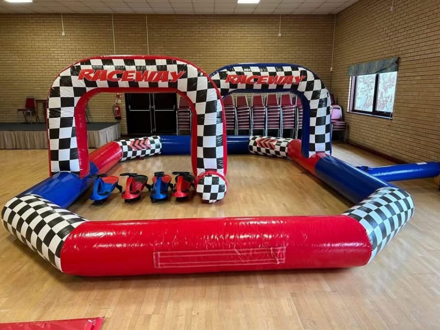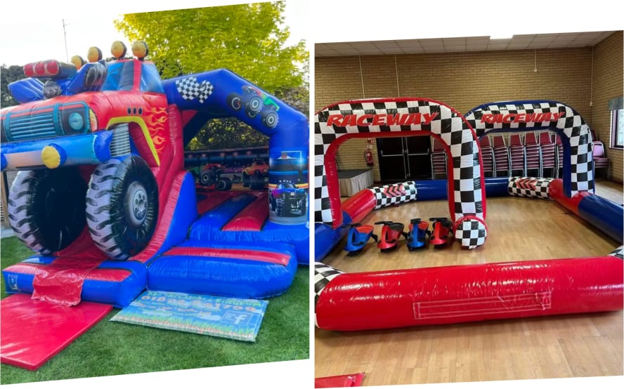 Stuck for Children's party ideas in Essex then this brand new inflatable party package maybe just what you are looking for to entertain your party guests . Firstly this party hire package set contains our very popular 3D monster truck slide castle featuring a large bounce area and bright and vibrant artwork across the front and to finish this castle off there is a slide coming out from the front in the shape of a giant 4X4 Monster truck , Add to that we also supply an inflatable race track and 4 swing cars for the guests to zoom around and see who will be the next Sir Lewis Hamilton and claim the chequered flag . Should you wish to add more of the very popular swing cars then we have these and many fantastic party ideas on