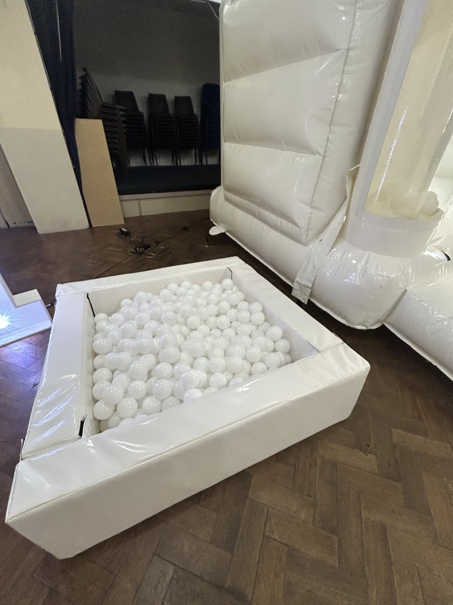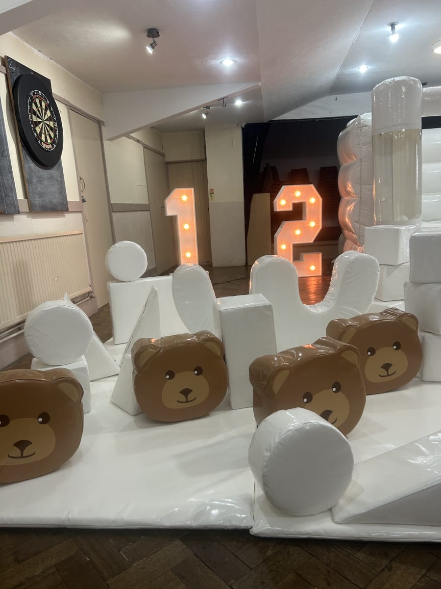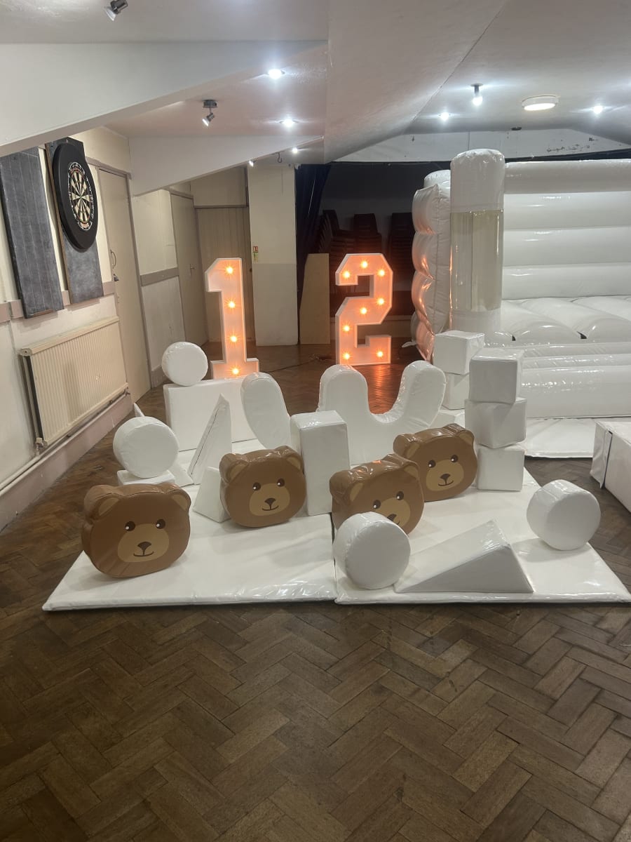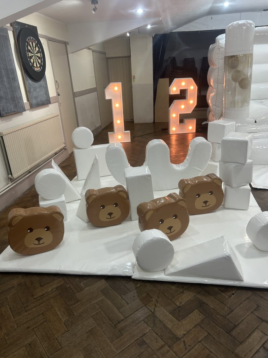 Stuck for children's party ideas in Chelmsford then we have this fantastic beary first birthday white soft play and ball pool soft play set we hire all over Essex on our hire fleet , This soft play set comes with 18 bits of white soft play and also 4 large and cute teddy bear shapes guaranteed to keep your young party guests entertained for hours upon end we also supply a large matted safety area and to finish off with you also get a ball pool complete with matching balls for a party set up to dazzle your guests and leaving them in awe of you party entertainment you have laid on .