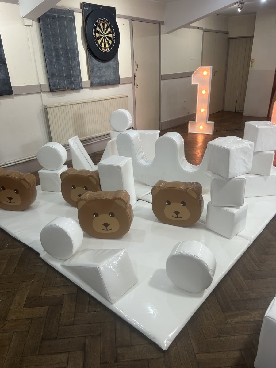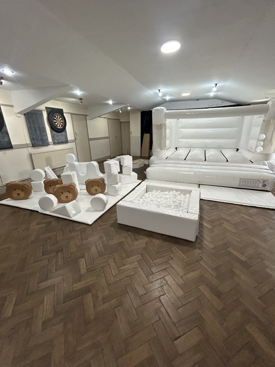 Looking for white soft play and bouncy castle hire in Chelmsford and surrounding areas with a slight twist then we have our fantastic beary first birthday soft play set up with matching castle we hire all over Essex , featuring 20 bits of soft play with 4 cute teddy bears this really will keep your young party guests entertained add to that the matching ball pool complete with balls and a large safety matted area and for the slightly older ones this white party package also comes with a high gloss white bouncy castle with the added feature of clear panels on the from so you can insert matching coloured balloons for the ultimate finish that will leave your guests amazed at the wow factor we have supplied . Want an extra special finishing touch if you are celebrating a birthday then we also have